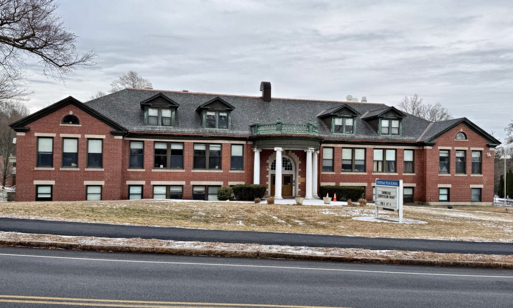 The General Draper Memorial High School is one of the many civic and institutional buildings in Hopedale Village that were donated to the small industrial community by members of the wealthy Draper Family, who operated the Draper Corporation Factory in town. The school was built in 1927 on land donated to the Town by Princess Margaret Bonocompagni, the youngest child of the late William F. Draper, who married Prince Andrea Boncompagni of Italy in 1916. The marriage ended in divorce by 1924 and years later, she had no need for the family home in Hopedale, and bequeathed the site to the community for a new high school in memory of her late father. General William Franklin Draper (1842-1910) was a Civil War veteran who became a politician and managed the Draper company in Hopedale, where he built a massive mansion for his family. The mansion was demolished and replaced by this Colonial Revival style High School, designed by New Hampshire-based architect, Chase R. Whitcher, the handsome structure has since been expanded at the rear to service the growing student population in town.