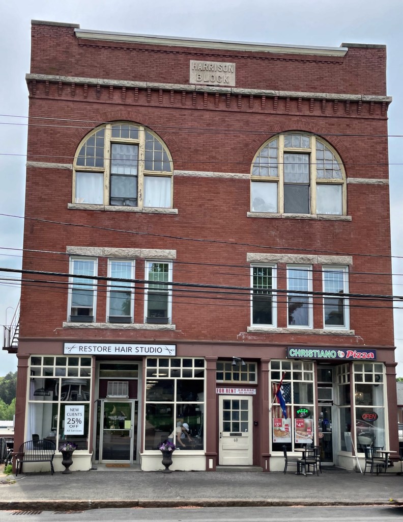 One of the few historic commercial buildings in Hopedale Village is this Romanesque Revival style example on Hopedale Street which, like so many other buildings in the village, was largely funded by members of the Draper Family. The commercial block was built in 1889 by Gen. William F. Draper and named in honor of President Benjamin Harrison, 23rd president of the United States, as a multi-use building, containing a drug store, a retail, a club house on the second floor, a storage and cobbler at the rear of the building in the basement, and a lodge on the third floor for large meetings. Less ornate than many other buildings in town built for the Draper’s, all decorative features on the Harrison Block are confined to the façade. With original storefronts of wood and glass display windows at the ground floor, tripartite windows at the second floor, and large, round-arched windows at the third floor, evoking the Romanesque style of the Town Hall (also funded by the Draper Family) nearby.