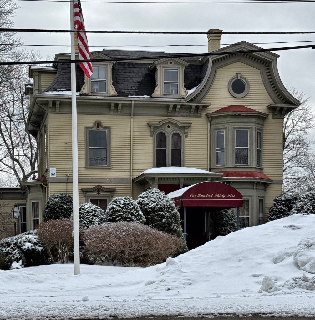 The Fisher-Mason Mansion on South Street in Wrentham, Massachusetts, is among the town’s finest and well-preserved Victorian-era homes. The house is said to have been funded and built in 1868 by Thomas Proctor (who lived in a large Mansard house overlooking the town common) for his daughter, Emma Proctor as a wedding gift upon her marriage to husband, Henry Kollock Fisher, a shoe manufacturer. The couple lived in the home, raising four children here until 1910, when the Proctors sold the property to Otis N. Mason of Providence. Today, the Fisher-Mason Mansion is known as the R. J. Ross Funeral Home, who have operated a funeral home from the residence since before WWII. The mansion features a mansard roof with unique mansard gable at the side sheltering an ocular window.