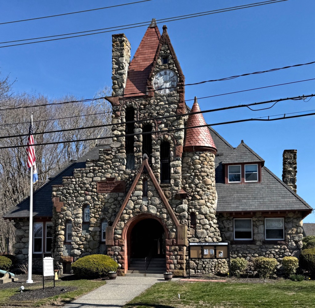 The Swansea Town Hall in Swansea, Massachusetts, is one of the most unique and architecturally eclectic town hall buildings in New England, and was a gift to the community from a wealthy resident. Built in 1891 from plans by Boston architect, James Merrill Brown, the building is constructed of randomly laid rubblestone with brownstone trim with a massive pyrammidal slate roof and offset turret and tower containing a historic clock. The building was the gift of benefactors, Frank Shaw Stevens and Elizabeth Case Stevens, who lived down the street in the town’s largest mansion. The Stevens’ donated the building with the stipulation that the building was to be available to every and any religious society desiring to hold funeral services there and to also provide space for a public library. The town obliged. The space was outgrown and the Stevens’ would later donate the town’s public library next door and a church, that also held funeral services for the community. The building has been home to the Town Hall since 1891.