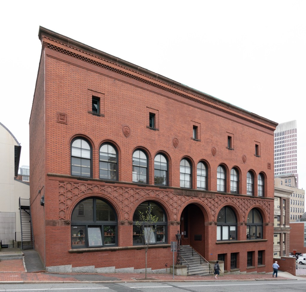 An early example of the Romanesque Revival style, the former Central Congregational Church on Benefit Street in Providence’s East Side is architecturally significant as one of the remaining designs by architect, Thomas Tefft and built from 1853-1856. Thomas A. Tefft (1826-1859) was one of the nation’s first professionally trained architects and was a master of Rundbogenstil, a German-branch of the Romanesque style until his untimely death in Italy when he was just 33. When this church was completed in 1856, Tefft was just thirty years old. The brownstone facade is adorned by triple-arched entrances and corbelling. The congregation grew and decades later, acquired a site in the neighborhood for a larger, Carrere and Hastings-designed church, vacating this building in 1893. The Rhode Island School of Design (RISD) purchased this former church in 1902 following a donation by Eliza Radeke and her brothers who named the building Memorial Hall. The firm of Hoppin and Ely was hired to update the former church for use by the college, which primarily took place on the interior. The original pair of tall bell towers were damaged during the 1938 hurricane and later were removed in 1950, truncating the verticality of this great Tefft-designed building, but she still shines! Memorial Hall has been incorporated into the RISD Museum.