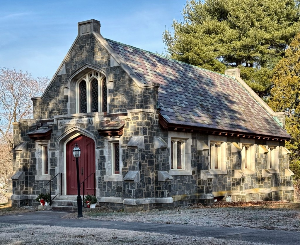 Located in Fountain Hill Cemetery, which has become a sort of Rural Cemetery in the small town of Deep River, Connecticut, this handsome gothic chapel graces the entrance and has provided a place of solemn memorials and celebrations of life for over 100 years. The Fountain Hill Cemetery was originally established in 1851, but after a half-century of use, Miss Mary McCellan Wooster (1839-1911), sought a non-denominational chapel for the grounds to not only beautify the local cemetery, but provide a place to honor the dead. In her will, Miss Wooster left $10,000 for a new chapel. The cemetery board of directors hired architect, Isaac Allen, Jr. of Hartford, Connecticut, to design the structure. The Neo-Gothic chapel was built of local stone and opened to the public in April 1915.