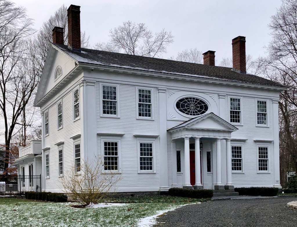 This architecturally unique and stunning Federal style house in Chester, Connecticut, was built in 1820 on the Middlesex Turnpike by Abram Mitchell for $10,000, double what he originally hoped to pay for the residence. The principal builder was Samuel Silliman, a locally well-known master carver, who clearly showcased his skill inside and out, much of which has been preserved by two centuries of owners. In 1845, the property was purchased by George Spencer, and presented as a wedding gift for his daughter, Julia, who married Dr. Ambrose Pratt (1814-1891). Dr. Pratt became well-known for his practice of hydropathology and temporarily used his house as a sanitarium known as the Chester Water Cure. The house was acquired by the local Roman Catholic Church and became the parish center until the residence was purchased and moved away from the busy street to its current location in 1966. In the 1980s, the house was purchased by famed artist, Sol Lewitt. The house has a large spider web window, still containing the original glass over the door and full-height pilasters dividing bays and inside, many stunning carved mantles and woodwork.