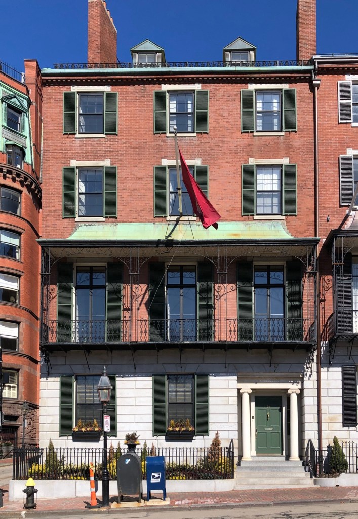 The land at the corner of Beacon and Joy streets in Boston’s Beacon Hill neighborhood was once John Hancock’s west pasture for his grand manor (razed in 1863) until 1819, when subdivision of the Hancock estate began following his death. In 1821, Israel Thorndike, one of the leading land speculators of early nineteenth-century Boston, began buying out the Hancock heirs and house lots overlooking the Boston Common were sold to John Hubbard and George Williams Lyman, who hired architect Cornelius Coolidge, to build some stately Greek Revival townhomes for wealthy Boston elites. The house at the corner of Beacon and Joy streets, 34 Beacon Street, was built in 1825 for Nathaniel Pope Russell, a leading Federal period China Trade merchant. By 1850, James B. Bradlee, a wealthy merchant, had acquired the property. Bradlee’s grandson Ogden Codman Jr., the influential late nineteenth- and early twentieth-century architect and interior decorator, was born in this house in 1863. Codman later collaborated with novelist and tastemaker Edith Wharton on ‘The Decoration of Houses‘, a book that had an enormous impact on the direction of interior design when it was published in the 1890s. Little, Brown and Company, a publishing company founded in 1837, purchased the former residence and moved their headquarters here in 1909. The publishing company sold the property in 1997, and it converted to a single-family home. In 2007, the residence was purchased by Northeastern University and has since been the President’s House.