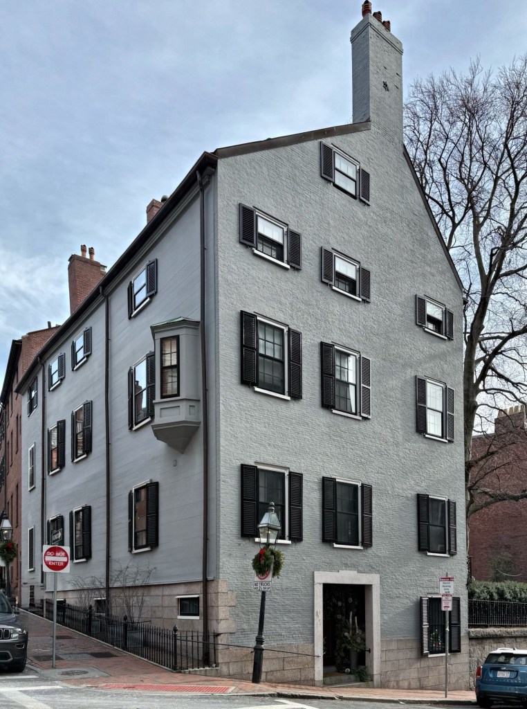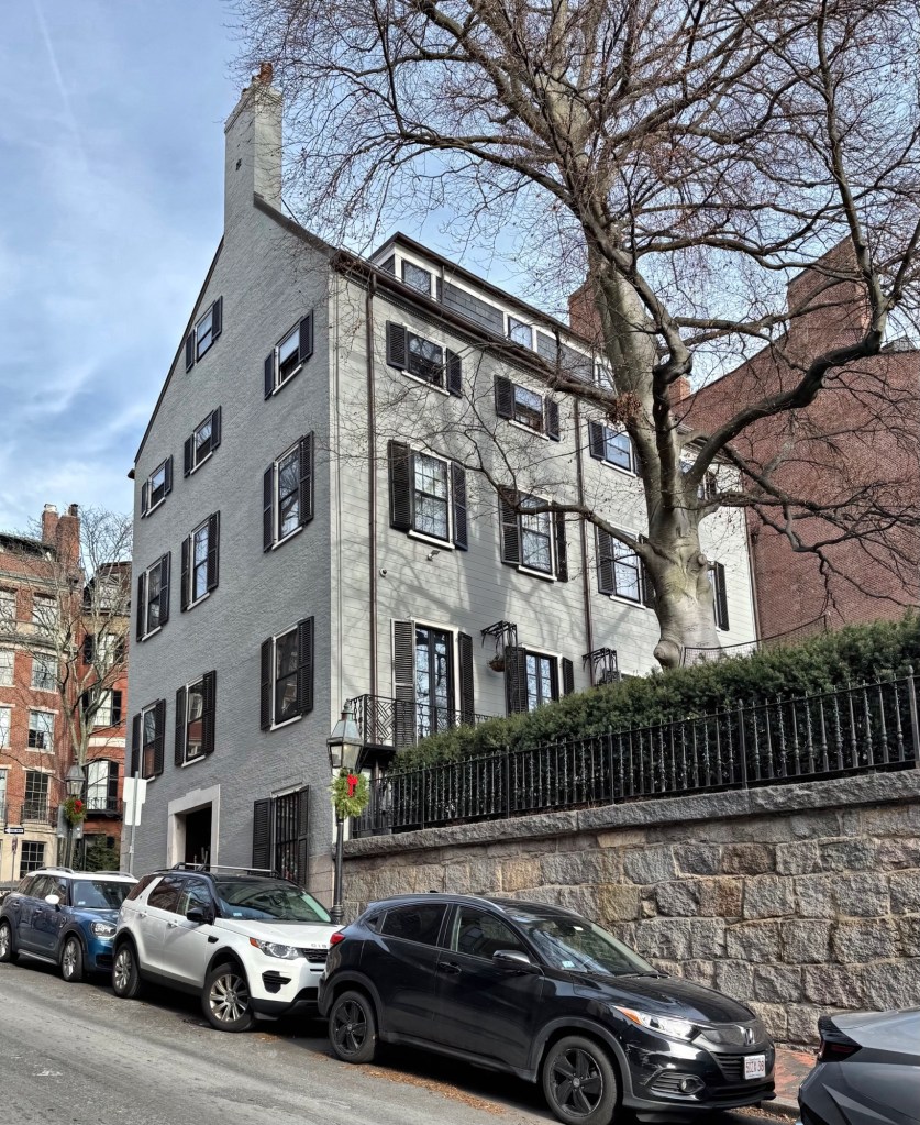 Built in 1802, this large residence at 14 Walnut Street is among the oldest extant mansions on the South Slope of Beacon Hill and includes a large hidden garden behind a granite block retaining wall. John Callender, Clerk of the Supreme Judicial Court of the Commonwealth, purchased land at the corner of Mount Vemon and Walnut streets for $2,000 and immediately started construction on his requested “small house finished for little money $5,000-$7,000”, but this was anything but modest. The house originally had its primary facade facing Mount Vernon Street, but in 1821, Walnut Street was lowered by city officials, so Callender had the granite retaining wall built for the garden and new entry built on Walnut Street. Mr. Callender lived here until his death in 1833 and the property was purchased by members of the Lyman family and later by Harriot Curtis (1881-1974) an early amateur female skier and golfer who used her fortune as a philanthropist, funding medical facilities in Boston for impoverished immigrants and served as dean of women in Hampton Institute in Virginia, an HBCU from 1927-1931. The most significant owner, Ellery Sedgwick (1872-1960), lived here from 1908 until his death in 1960. Sedgwick worked as editor of the Atlantic Monthly (now known as The Atlantic), and under his ownership, the magazine became one of the most circulated magazines in the world. The Callender-Sedgwick House features unique flushboard siding, providing a seamless surface that resembles a masonry wall when painted earth tones and a 19th century oriel window. The brick end elevation is punctuated with bays of hung windows and the recessed entry with a long, granite garden wall which has been well-preserved by owners.