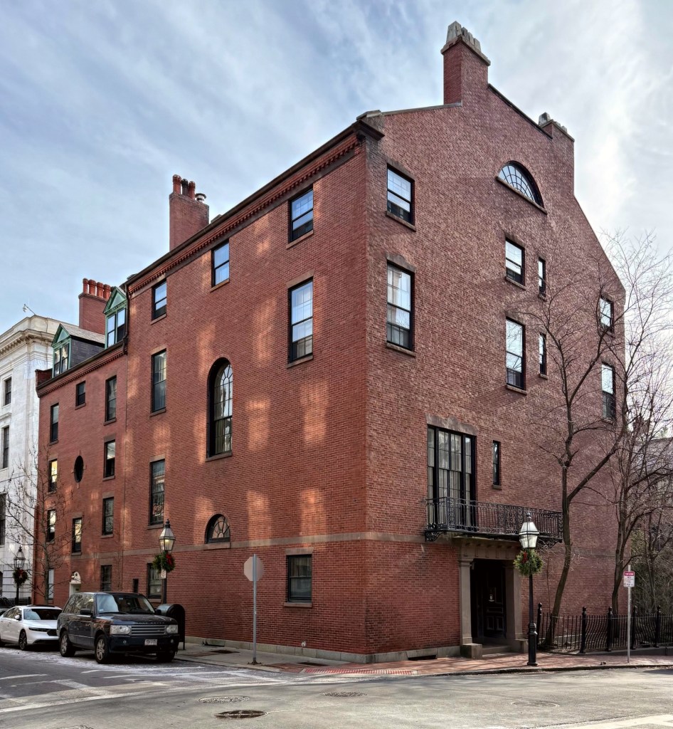 The Lyman-Paine Mansion at the corner of Joy and Mount Vernon streets in Boston’s Beacon Hill neighborhood is an architecturally significant Federal style house designed by a skilled architect and was owned by members of prominent local families. This four-story mansion was designed in 1824 by architect Alexander Parris for George Williams Lyman (1786-1880), a shipping merchant who became one of the Boston Associates, a group of wealthy Bostonians who funded the expansion of New England textile mills, which helped grow many industrial communities all over the region in the 19th century. This house served as Lyman’s winter estate, his summer mansion was the the Lyman Estate, “The Vale”, in Waltham, which he had inherited from his father. Upon George Lyman’s death in 1880, Lydia Lyman Paine, George’s youngest daughter, inherited this Beacon Hill mansion. Lydia’s husband, Robert Treat Paine, was a graduate of Harvard and a successful local attorney. Mr. Paine retired from law in 1872 to become the treasurer for the new Trinity Church building committee, where he averted a fiscal crisis during the mid-1870s when Henry Hobson Richardson’s cost overruns in designing the new Copley Square church threatened its completion. In addition to his pro bono work with Trinity’s finances, Paine was deeply interested in improving the quality of life of the working class, founding building and loan associations and institutes to allow immigrants to buy homes in the Boston area. In addition to their Joy Street mansion, the Paines had a country estate called Stonehurst, which is adjacent to the Vale in Waltham; it was renovated by Richardson. The mansion was converted to apartments (now condos) in the mid-20th century, and maintains its unique, vernacular Federal character, with asymmetrical facade and oddly placed and shaped windows.