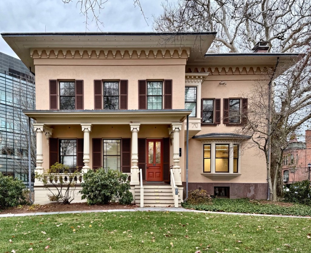The James Dwight Dana House at 24 Hillhouse Avenue in New Haven, Connecticut, is a landmark early example of an Italianate style residence designed by a famed 19th century architect. Built in 1849 from plans by architect Henry Austin, the house was constructed for owner, James Dwight Dana (1813-1895) and his new wife, Henrietta Silliman and possibly funded by her father, Benjamin Silliman, a Yale professor who was considered “The Father of Science in America”. James Dwight Dana’s education in geology, in addition to his studies with his father-in-law, Professor Silliman, extended to the four-year United States Exploring Expedition between 1838–1842), in which Dana served as the staff geologist and mineralogist, exposing him to a wide-ranging variety of geological formations and minerals. Upon his return to New Haven, he married Silliman’s daughter and then moved into this stately home. Later in his career, Dana was responsible for developing much of the early knowledge on Hawaiian volcanism. In 1880 and 1881 he led the first geological study of Hawaii. The James Dwight Dana House has a three-bay front facade, with a single-story porch extending across its width, supported by wooden columns with unique capitals. The shallow roof has broad, overhanging eaves sheltering a unique corbelled brick cornice. The building was added onto in 1905 with similar architecture and was purchased by Yale in 1962. Today, the building is preserved by the University and houses the Institution for Social & Policy Studies (ISPS).