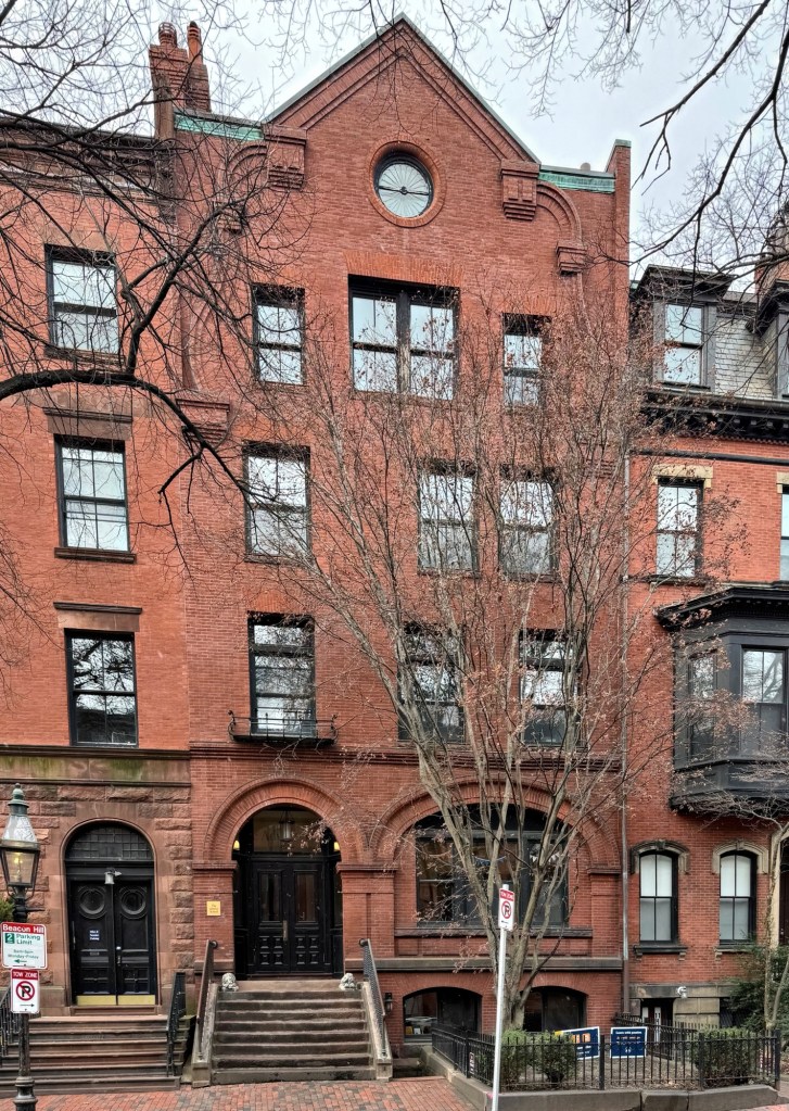 One of the many great townhouses on Brimmer Street in Boston’s Beacon Hill neighborhood is this residence designed as a unique interpretation of Queen Anne and Romanesque Revival styles. Original owner, Eliot Channing Clarke (1845-1921), an MIT-educated civil engineer. His uncle, Thomas Curtis Clarke, was a noted civil engineer, a member of the firm of Clarke, Reeves & Co., Bridge Builders in Pennsylvania, and served later as President of the American Society of Civil Engineers. When Thomas Clarke’s firm was designing and building a new bridge over the Mississippi River in Quincy, Illinois, he had his nephew lead in the design. In 1876, Eliot was appointed engineer in charge of a survey for a main drainage system for Boston. The project was adopted and construction began a year later, taking years to complete. In 1885, Clarke published the work that he oversaw, modernizing a rapidly growing Boston water and plumbing system. He became one of the leading sanitary engineers of the United States. In 1884, Clarke hired architect, S. Edwin Tobey, who designed this townhouse with a unique gable containing a ocular window and panel brick parapet as an interpretation of a Flemish gable. A traditional arched entry in brick is a nod to the Romanesque Revival style, which surged in popularity in Boston following the completion of H. H. Richardson’s Trinity Church. In 1969, the Clarke house’s interior was connected with its neighbor as the Advent School, a private K-6 school associated with the Church of the Advent across the street.