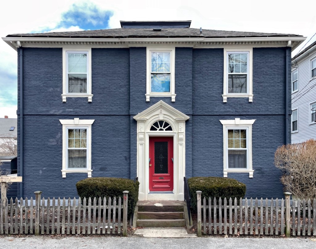 This elegant brick Federal style residence in Warren, Rhode Island, was built around the turn of the 19th century, sometime after Liberty Street was laid out in the mid-1790s. An excellent example of the Federal style finished in brick, the three-bay residence features a projecting belt course between the first and second stories, corbels and flared lintels at the windows, a hipped roof surmounted by a small, centered platform, and an elaborate entry with pediment and elliptical fanlight transom. The builder is not known at this time, but the house was owned by George C. Hazard and later inherited by his son, George G. Hazard and later by Mary Jane Hazard, who remarried to Lucius Warner. In the early 20th century, the property was purchased by Gottlieb and Louise Gempp, proprietors of the local American-German Club. Despite having its brick painted, the Hazard-Gempp House remains as one of the town’s great and well-preserved Federal period homes built of brick.