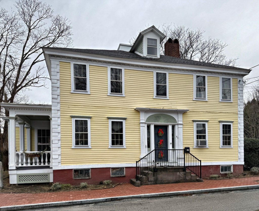 One of the great Federal style homes in the charming downtown of Warren, Rhode Island, the Salisbury-Johnson House at 43 Miller Street features many of the hallmarks of the prominent architectural style. The main body of the house was constructed by 1823 after Theophilus Salisbury (1781-1835) purchased the house lot at the corner of Union Street, possibly being moved from another site to the present location at this time. The two-story, five-bay façade is detailed by quoined corners and an exceptional center entrance with sidelights and large, elliptical blind fan carved from a single piece of wood. After later owners, the property was purchased by Rodolphus B. Johnson (1816-1884), a wealthy shipping agent who owned whaling ships and ran a wharf at the foot of Johnson Street nearby.