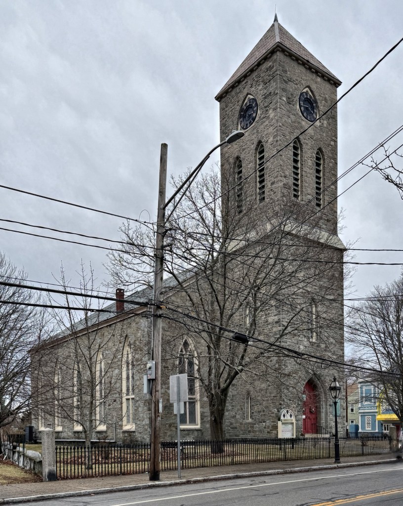 The Warren Baptist Church on Main Street in Warren, Rhode Island, is a landmark example of an ecclesiastical building in the Gothic Revival style completed in stone. Like many communities in Rhode Island, Baptists in Warren, were the first and largest denomination in the community, dating back to the 18th century. The congregation’s first purpose-built church was constructed in 1764 and was burned by the British in 1778 as they left Warren. Its replacement (1784) was demolished for the present building sixty years later. Interestingly, this site is significant additionally as the site of the founding of Brown University. as when Reverend James Manning was called in 1764 to take over the congregation and its new church building, he did so with the proviso that he could open a school for the training of Baptist ministers because all existing colonial colleges at the time provided for training only in the Congregational and Episcopal ministries. The school was located behind the present location of the church and it spent its first four years here in Warren, holding its first commencement in that church until the new school (and Reverend Manning as president) were lured to Providence, where Brown University has remained ever since. The present Warren Baptist Church was built in 1844 and was designed by famed Rhode Island architect, Russell Warren, who is best-known for his work in the Federal and Greek Revival styles, but here shows his expertise and skill in the Gothic mode. The building is notable for its lancet-arched windows and belfry with narrow lancet arched louvered windows set below the clock faces set in triangular trefoil tracery. The congregation also maintains Tiffany windows donated by members of the church.
