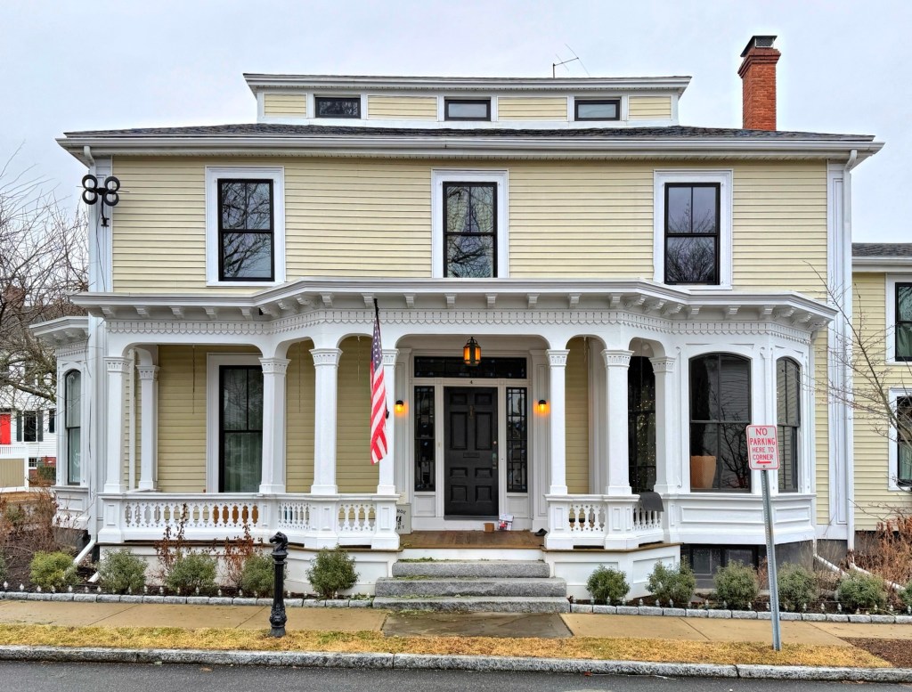 While a part of this Warren, Rhode Island, home may date from as early as the late 18th century, it was completely “modernized” in the mid-19th century by owner, Lewis T. Hoar, a successful housewright, giving us the playful design we see today. Lewis Thomas Hoar (1810-1881) worked in partnerships, building many of the stately Italianate style residences in the village of Warren before entering politics, where he was elected as a state representative. Rather than building his own home from scratch, Lewis updated an earlier Federal period house, retaining its Federal-era hipped roof with monitor, but added the more intricate bay windows and porch, embellished with carved balustrade, brackets and ornament. The large property even retains a Second Empire style stable or barn, which has been preserved by later owners.
