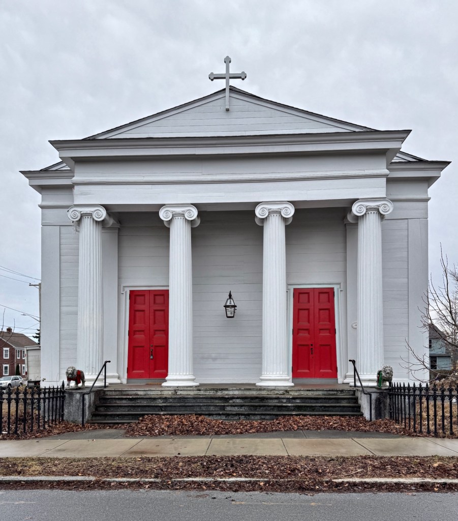 St. Mark’s Episcopal Church in Warren, Rhode Island, is a small, yet architecturally significant building that was one of the first examples of the Greek Revival style in the community. The episcopal church was formed in Warren in 1828, with members originally meeting in Cole’s Hotel while this site and construction completed on their new house of worship. The well-connected congregation hired architect, Russell Warren, who had just completed the Westminster Arcade, a landmark in the Greek Revival style, in Downtown Providence. Distinguished by its beautiful four columned Ionic portico and canted door frames, the church also originally had a square tower and parapet, which were removed following the 1938 hurricane, and replaced with a simple pediment. The parish closed in 2010 and the diocese sold the building in 2012 to private owners, who converted it about ten years ago into a residence, but retained the historic stained glass windows and character of the building. The entire site today (2026) is being renovated with what appears to be a modern addition on the side (not pictured). Hopefully the architecture of this landmark will be preserved.
