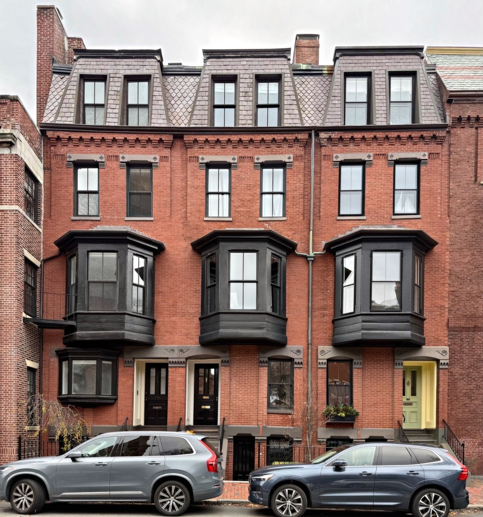 These three identical three-story houses at 156, 158 & 160 Mt. Vernon Street in Beacon Hill Flat were built in 1871 as income producing properties for Samuel and Emily Otis Eliot who lived next door on the corner of Brimmer Street. The architect is not evident from my research, but they were likely designed by Abel C. Martin, who furnished speculative housing for the Eliot’s elsewhere in the neighborhood. All three residences feature brick facades with off-center recessed entries on raised stoops. The use of brownstone lintels and sills, decorative brick cornice, and second-story hexagonal oriel windows add intrigue to the design, along with the slate mansard roofs. The three houses were sold or rented and all were owned by various families, but notable owners of the central house include the architect George Russell Shaw (1848-1937) of the firm Shaw and Hunnewell through the early 1900s. Later in the 20th century, the house was owned by Kevin White (1929-2012), who served as the mayor of Boston for four terms from 1968 to 1984.