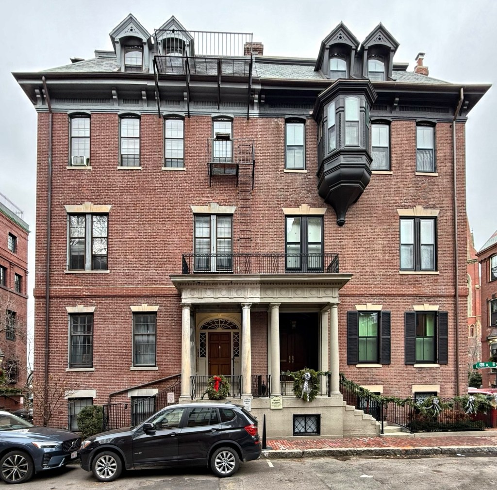 These two near-identical townhouses at 1 & 2 Otis Place in Beacon Hill are significant architecturally and as they are bounded by four streets. The unique lots were created when Otis Place was laid out on made land in 1869 and were built the following year as an identical pair sharing a party wall and with their front facades facing south on Otis Place. The two residences were designed by the firm of Ware and Van Brunt, who blendedSecond Empire and Victorian Gothic styles with gothic arched windows, bracketed cornices, slate mansard roof, and later Colonial Revival porticos added in 1916 by architect, Frank A. Bourne. No. 1 Otis Place (right side with the oriel bay window) was first owned by Henry G. Pickering, a dealer in engines and machinery at the height of New England’s industrial revolution. No. 2 Otis Place (left with later fanlight entry), was originally owned by Robert E. Apthorp, an attorney and realtor, who decades earlier, was an active member of the Boston Vigilance Committee, the group established to harbor and assist fugitives from slavery after the passage of the Fugitive Slave Act in September 1850.