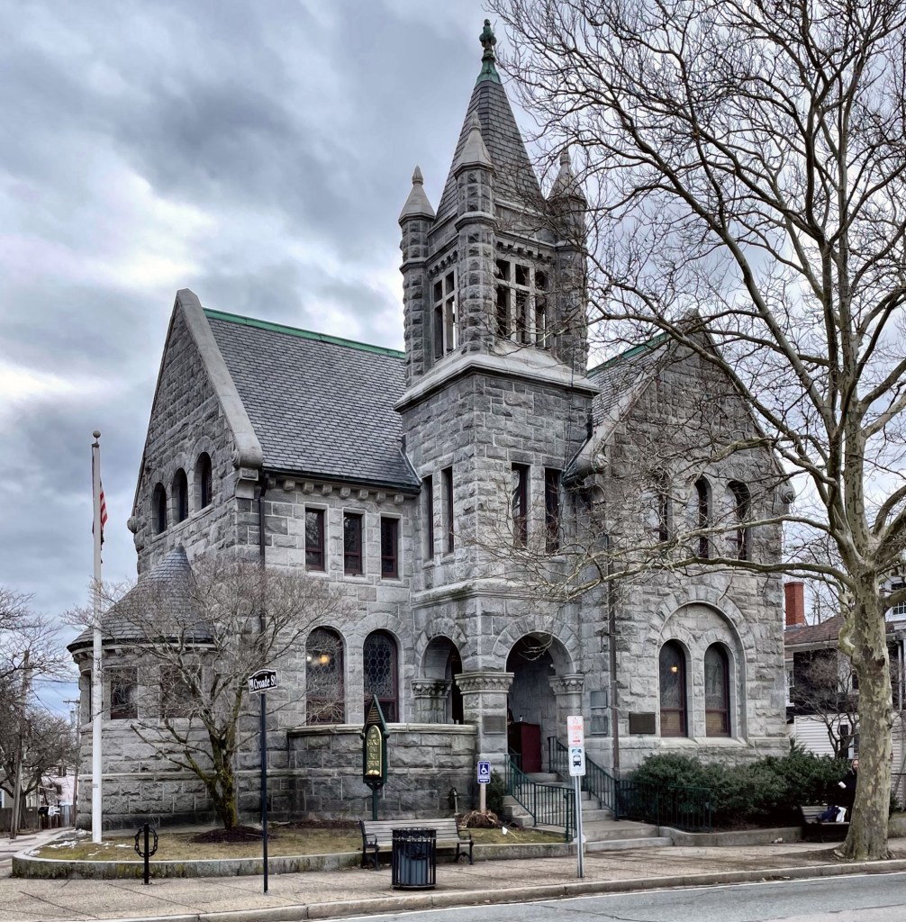 The George Hail Free Library on Main Street in Warren, Rhode Island, is a unique, Victorian-era public library building that has been lovingly preserved by the community. Built in 1888, the building cost just over $16,000 and was designed in a more vertical expression of the Romanesque Revival style by the Providence architectural firm of William Walker and Son and built of rough-faced granite. The library is named after George Hail (1793-1873), a merchant, philanthropist, industrialist, and native son of Warren. His second wife, Martha Hail died in 1882 and left $5,000 and their home to the Warren Public Library provided that the name of the Library be changed to the George Hail Free Library in memory of her husband. The Library Committee agreed and planning began soon after for a new, purpose built library we see today. The exterior is distinguished, but the interior is also well-preserved, with original cherry woodwork grained to resemble mahogany, brass gaslighting fixtures, fireplaces, and leaded glass windows patterned with stained glass, together with some of the original furniture, that preserve a sense of the original setting.