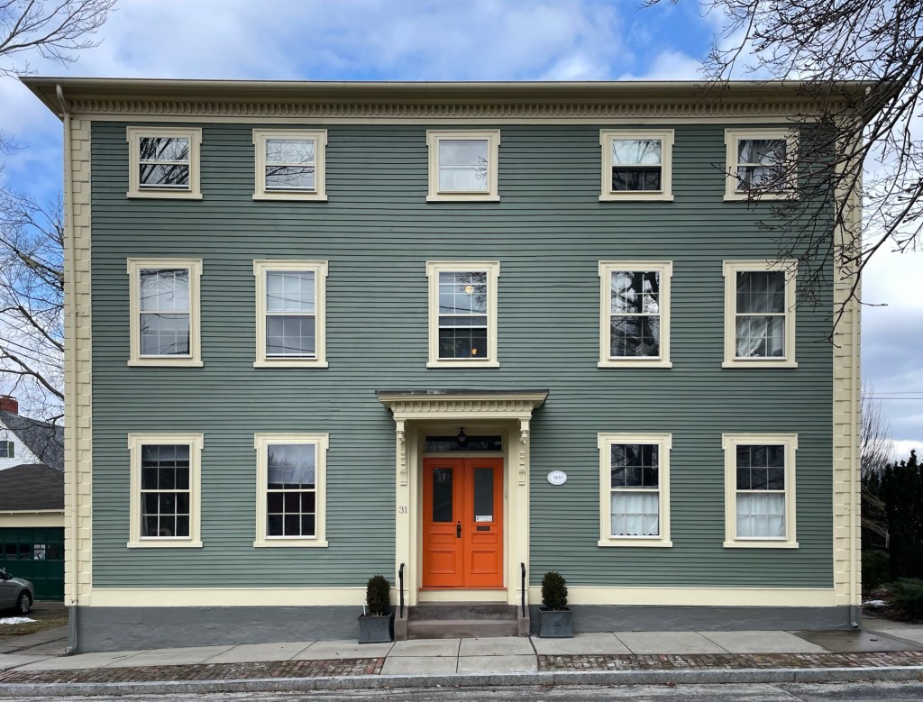 This stately three-story Federal style mansion on Baker Street in the lovely town of Warren, Rhode Island, was built in 1809 as a gift from a father to his daughter as a wedding gift. The house was funded by James Maxwell, of the local family of merchants and slave traders, for his daughter Martha “Patty” Maxwell and her soon-to-be husband, Samuel Randall. Judge Randall operated a school in town and published three local newspapers, the Telescope, the Clarion, and the Telegraph, all rather short-lived. In 1822, he was appointed judge of the court of common pleas for Bristol County, Rhode Island, and served in that capacity until 1824, when he was made justice of the supreme court of the state. The pop of color at the entry and the bracketed, Victorian era door hood complete the facade to give it some serious curb-appeal.