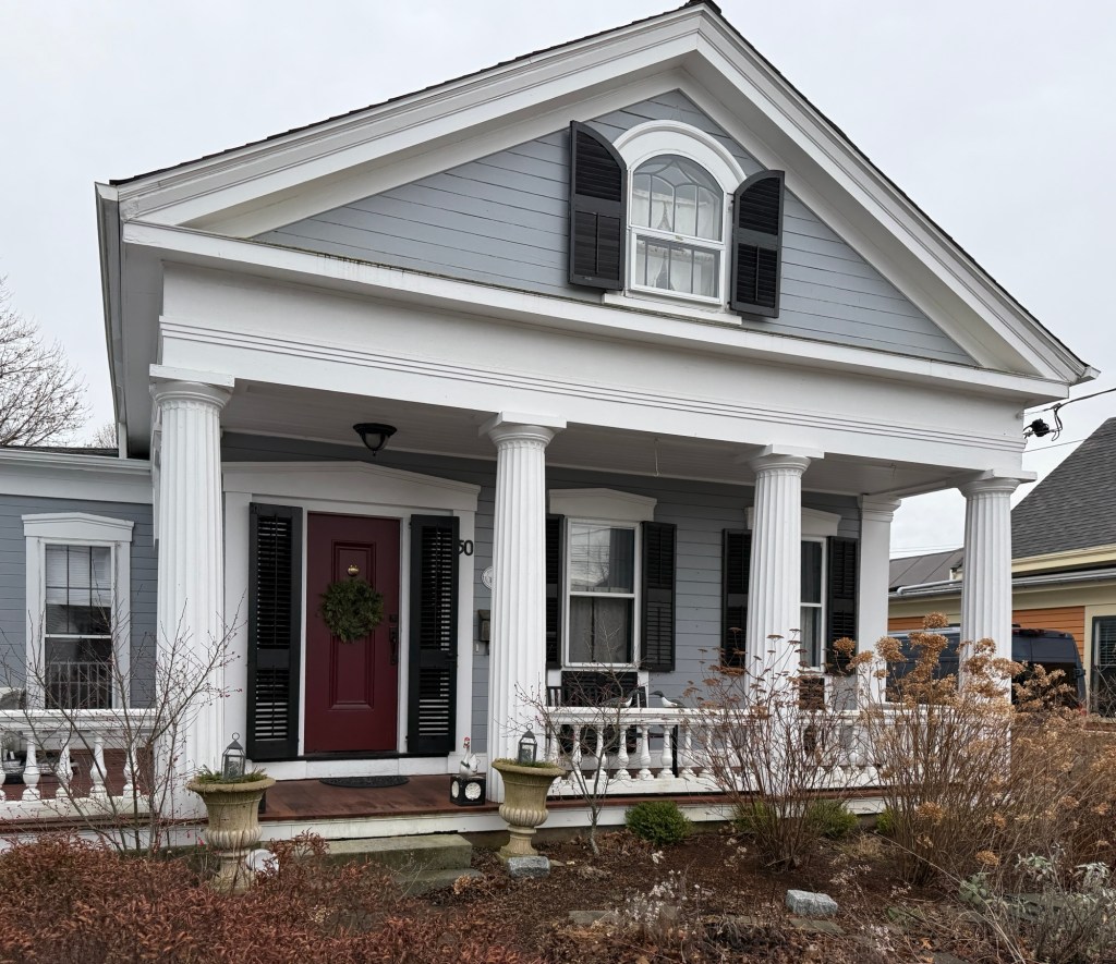The J. R. Hoar House on Washington Street in Warren, Rhode Island, is one of the best examples of a 1-1/2-story Greek Revival cottage in the town. The house has a full Doric portico in front, an arched second-story bedroom window in the pediment and pedimented lintels over the windows. Built in the 1841 for John Rodgers Hoar, the house has been lovingly preserved and restored by later owners.