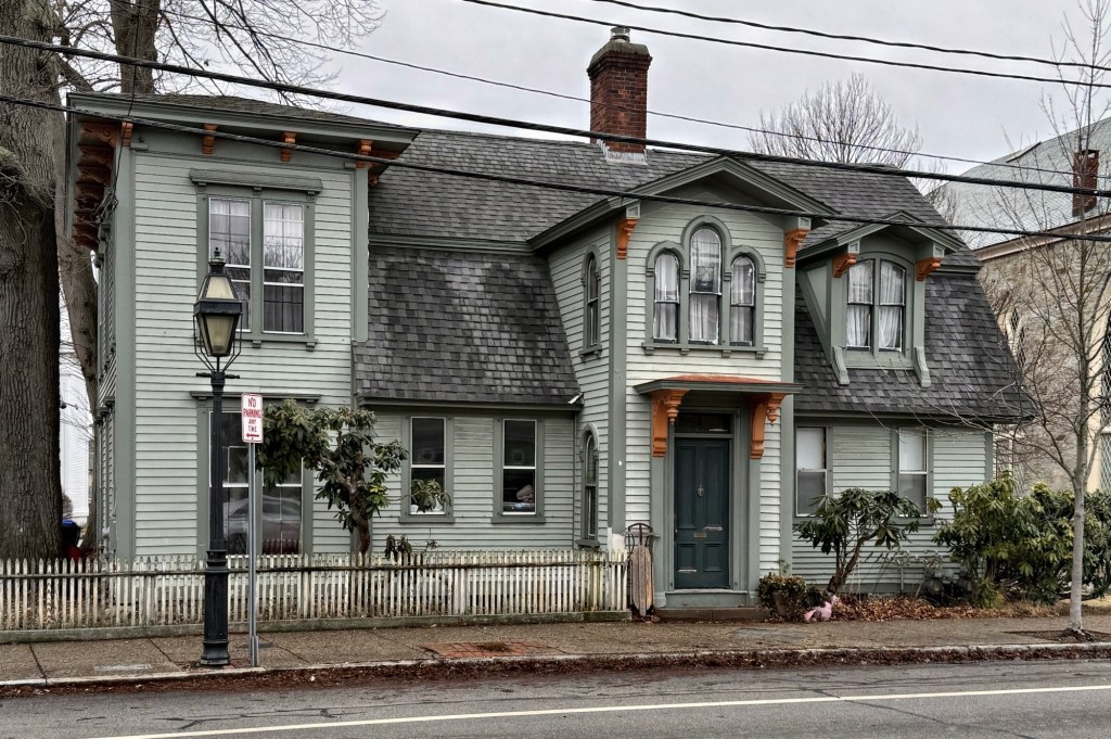 One of the most historic and architecturally unique houses in Warren, Rhode Island, is this pre-Revolutionary cottage on Main Street, that was modernized in the mid-19th century for later owners. Historians state that the house was built by Jesse Baker (1708-1751), who must have died shortly after its completion. At the time of the British burning of Warren during the Revolution in May 1778, Jesse’s widow resided here and saved the modest cottage from the hot embers of the adjacent burning Baptist Church, parsonage and arsenal by wetting every blanket and sheet in the house and spreading them over the roof of the home. The once modest, gambrel-roofed Georgian cottage, was purchased in 1868 by Dr. Joseph Merchant, a physician and surgeon, who “Victorianized” the house to the eclectic beauty we see today. Dr. Merchant added the projecting two-story corner tower, two-story front entry vestibule with Rundbogenstil tripartite window which reads like a Palladian window, projecting eaves with brackets, and stickwork in the north gambrel roof. The home was later inherited by Dr. Merchant’s daughter, Mary, and her husband, Howard K. DeWolf.
