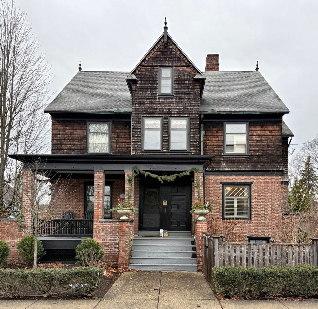 This unique Queen Anne style house at the corner of Washington and Eddy streets in Warren, Rhode Island, stands out for its use of materials and late Victorian design, a departure from the Federal and mid-19th century architecture the waterfront community is best-known for. The residence was built for Hannah and Erastus Buckingham and today remains essentially as originally built. Its slightly asymmetric massing combining multiple materials of brick and weathered shingles with diamond pane sash windows, illustrate early 20″ century design simplification while retaining the use of materials typical of late 19″ century Queen Anne style. Erastus Buckingham inherited his father’s oyster farming business, which harvested over 200 acres of beds in the bays off Nayatt, Conanicut, Quonset, Rocky Point and Patience Island before packaging and shipping to markets.