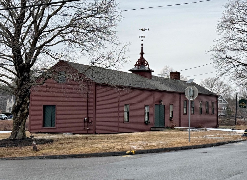 The area that is now the town of Hopedale, Massachusetts, was originally known simply as the “Dale,” a small, secluded agricultural area between Mendon and Milford, that beginning in 1842, was home to a communal Christian society called “Hopedale Community.” The communal agricultural and manufacturing society that eventually acquired over 600 acres and numbered more than 300 members at its peak before ultimately failing in 1856 due to socioeconomic inequalities and bankruptcy resulting from conflicts between its ideology and business organization. In that same year, the assets of Hopedale Community were purchased by the E.D. and G. Draper Company, led by Ebenezer and George Draper, who were the operators of Hopedale Community’s most successful manufacturing enterprise, textile machinery manufacturing. The Drapers had previously shared space in this old machine shop, which dates to around 1843, alongside fellow community workers who made hat and shoe boxes, sawed lumber, and ran an iron forge. As the Drapers founded the Draper Corporation, which became the largest maker of power looms for the textile industry in the United States, they never lost sight of their beginnings and preserved this building, which became known as the Little Red Shop. To preserve the building, it was moved four times in its life, to allow for the growth of the company factories, eventually being placed in its current location on town parkland, where it now houses a collection of Draper textile machinery as the Little Red Shop Museum. The Little Red Stop is just one story with nine bays and is vernacular in style, with its notable decorative feature being the metal weathervane mounted at the roof over an elaborate saw-cut wooden base.