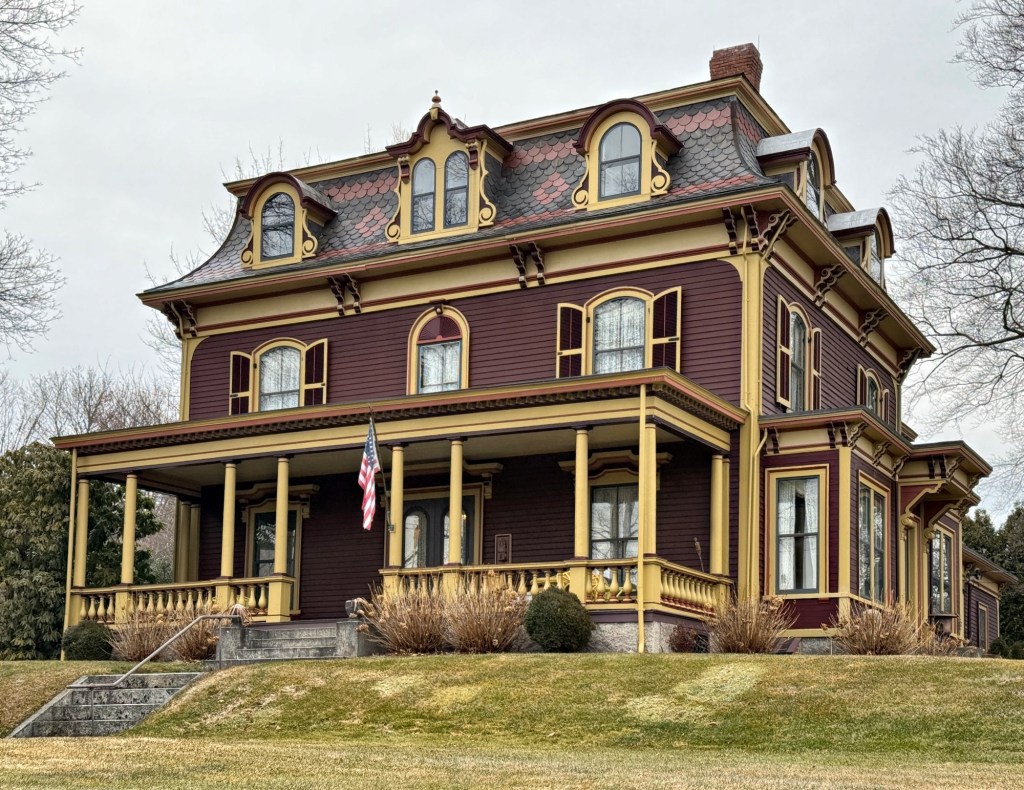 The finest example of the Second Empire style in the industrial village town of Hopedale, Massachusetts, is this stately residence at the beginning of Adin Street, which has been colloquially known as ‘Millionaire’s Row’ as it is lined with many large mansions owned by factory owners and managers. This is the Warren W. Dutcher House, built around 1860 for its namesake, a wealthy and well-connected manufacturer. Square in form, the house is capped by a concave mansard roof in slate, and features a cornice with paired brackets, round-headed dormer windows, and a central entry with door hood supported by oversized brackets all under the full-length porch. Warren Whitney Dutcher (1812-1880) was originally from North Bennington, Vermont, and in the 1850s, he invented a temple that worked better than one used by the Draper Corporation. are adjustable stretchers used on a loom to maintain the width and improve the edges of the woven fabric. George Draper bought an interest in it, and encouraged Mr. Dutcher to move to Hopedale to expand his operations. He moved to Hopedale in 1856, and built this home after a few years of managing the Dutcher Temple Company. After Warren Dutcher died in 1880, the home was inherited by his son, Frank Dutcher, until he built his own house on a lot behind his childhood home.