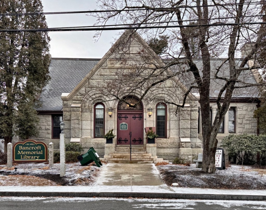 The Bancroft Memorial Library on Hopedale Street in Hopedale, Massachusetts, was built in 1898 and is one of the finest examples of a Romanesque Revival style library in New England. The library’s benefactor, Joseph Burbier Bancroft (1821-1909), moved to Hopedale and joined the Hopedale Community in 1846, where he became connected with the Hopedale Machine Company founded by the Draper Family. Shortly afterward Mr. Bancroft entered into a partnership with Ebenezer and George Draper, and was put in charge of the cotton machinery department of the Draper Corporation. Joseph married Sylvia W. Thwing, sister of the wives of Ebenezer and George Draper. As he rose through the ranks of the Draper Company, he decided to fund a library as a gift to the company town. Designed by architect, C. Howard Walker of the Boston architectural firm Walker & Kimball, the library is constructed of granite and features arched entry at the facade with carved stone panel above. Before the building was completed, Sylvia died, and the library became a memorial in her memory by Joseph Bancroft.