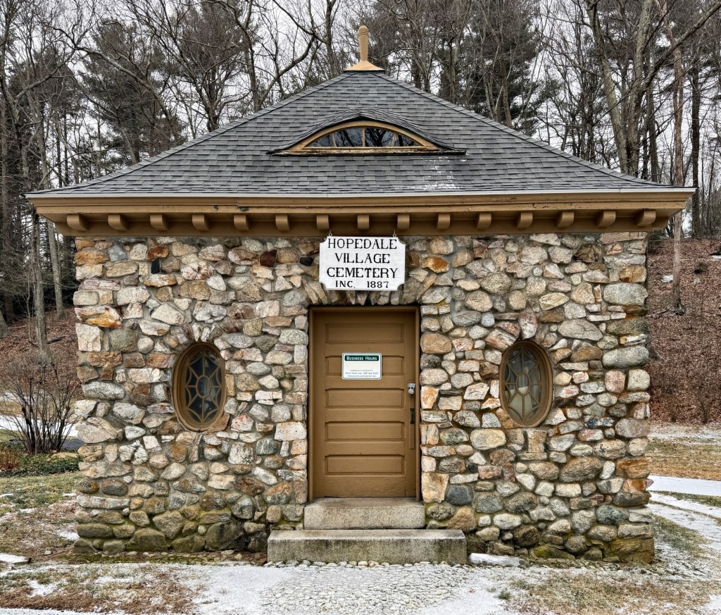 At the heart of the Hopedale Village Cemetery, this diminutive historic tool shed and office showcases that even for functional buildings set within a cemetery, high-quality materials and good design can enhance the landscape. The cemetery was laid out in 1845 in connection with Hopedale’s Utopian settlement, but expanded later in the 19th century as a formal landscaped cemetery in about 1887. The growth and investment of the cemetery coincides with the growth of the community as it prospered with the success of the Draper Corporation factories in town. Landscape architect, Warren Henry Manning updated the landscape here, with scenic vistas and hills, which followed the popular Rural cemetery movement of the 19th century. The cemetery contains many graves and mausoleums of the wealthy factory managers and benefactors of the community, which dot the sprawling landscape. In 1894, architect, Robert Allen Cook, designed this stone tool shed, which may have also contained a small office with cemetery records. The one-story, hip-roofed building features rough rubblestone walls with an eyebrow dormer centered on the façade, and has been preserved by the community for well over 100 years.