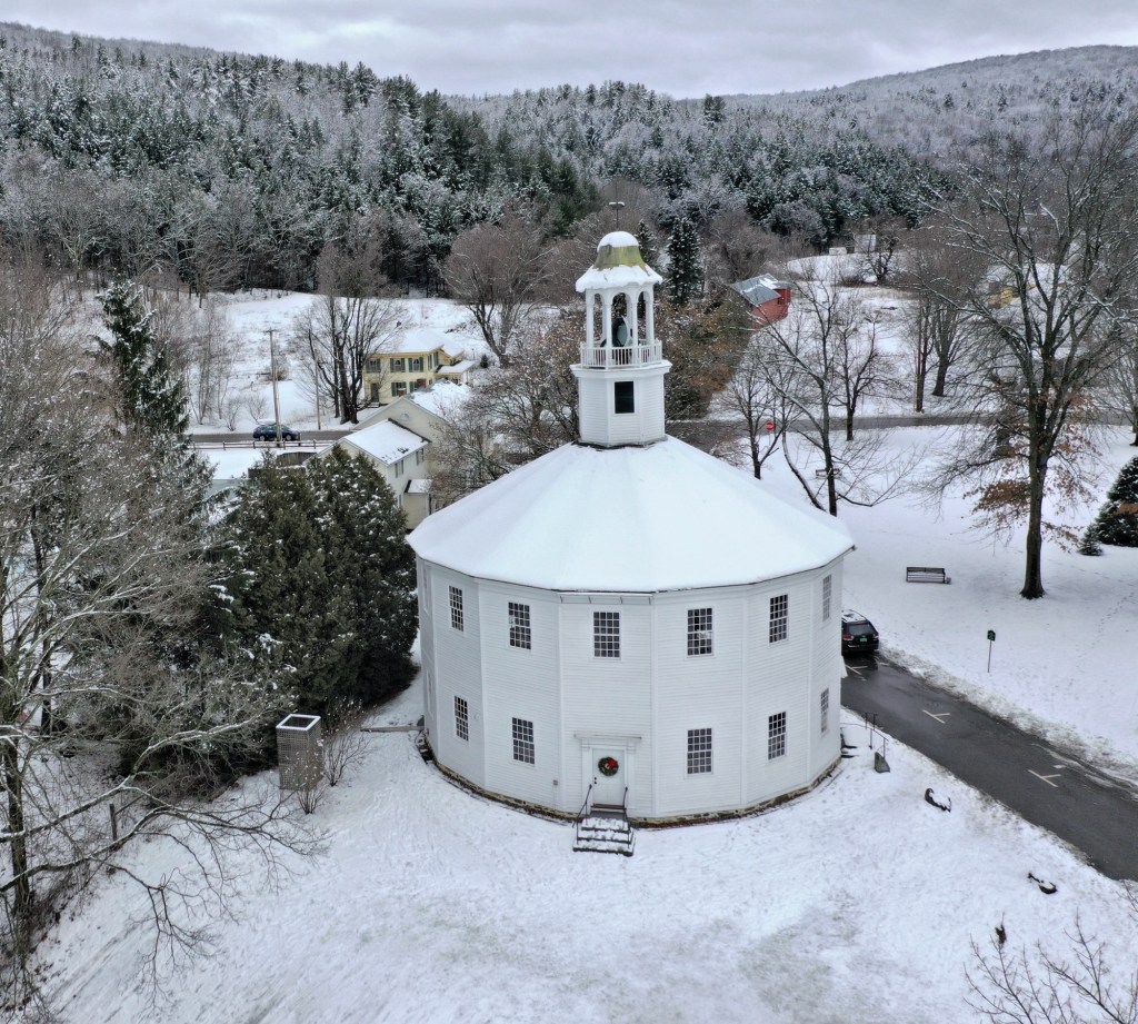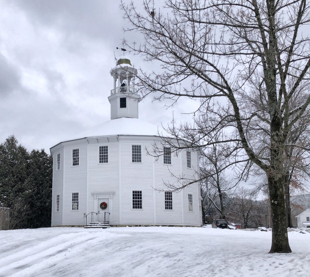 The Old Round Church in Richmond, Vermont, was built in 1812 on the village common to serve the town’s many congregations as a union church. The building is a master-work of housewright William Rhodes, who documented its construction in his journal and is a vernacular, yet grand Federal period church. While known as the Round Church, the building is actually a sixteen-sided hexdecagon with shallow angle cuts to create the rounded form, so the term round church sounds a little better than the Old Hexdecagon Church! Fifty feet in diameter, the two-story church rises to a hipped roof which is surmounted by a two-stage octagonal belfry with a bellcast cap and weathervane. Within a few decades of the church’s opening, the founding denominations began to move out, building their own houses of worship, and in 1880, the Old Round Church reverted to the Town of Richmond and continued in use as the town’s meeting hall until 1973, at which time safety concerns forced its closure to the public. The Richmond Historical Society was formed in 1973, shortly before the church had to be closed and in 1976, the town deeded the church to the society, who then gathered funds to restore the building. The Old Round Church remains one of the most unique architectural designs in Vermont and is always a treat to drive by in all seasons. The beloved building was declared a National Historic Landmark in 2000, one of just 18 in Vermont.