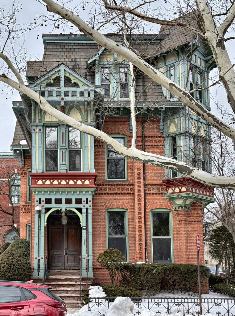 The Max Adler House on Greene Street in New Haven’s Wooster Square neighborhood is a flamboyant example of Victorian-era residential architecture that is hard to classify as an architectural style. The residence was constructed in 1879 for Max Adler (1841-1916) a German-born Jewish immigrant who grew up in New Haven and became a leader in industry at a young age. Max founded the Strouse & Adler Corset Company, which is said to be the first corset factory in the United States. The company did very well and he was able to erect this residence overlooking Wooster Square park for his family. Architecturally, the house has a mansard style roof, a feature of the Second Empire style; applied stickwork in the wooden bays, porch and dormers, a feature of the Stick style; and embroidered panel brickwork and terra cotta, elements of the emerging Queen Anne style. The Adler House has been lovingly preserved and is one of New Haven’s finest Victorian-era residences.