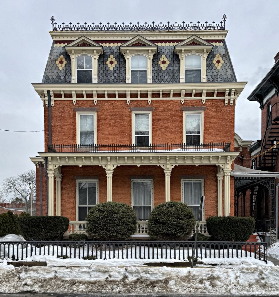 This handsome Second Empire style residence on Wooster Place in New Haven was built in 1833, but in the Greek Revival style and later renovated to its current appearance. The house was one of the earliest properties built fronting Wooster Square and constructed for merchant Theron Towner, who then sold it to Rev. Stephen Jewett (1783-1861), an Episcopal minister of a nearby church. The house was designed and constructed by James English, who later became a successful manufacturer and politician. It is unclear what the original house looked like, but after the Civil War, the house was renovated with the addition of the slate mansard roof with iron cresting and side porch.