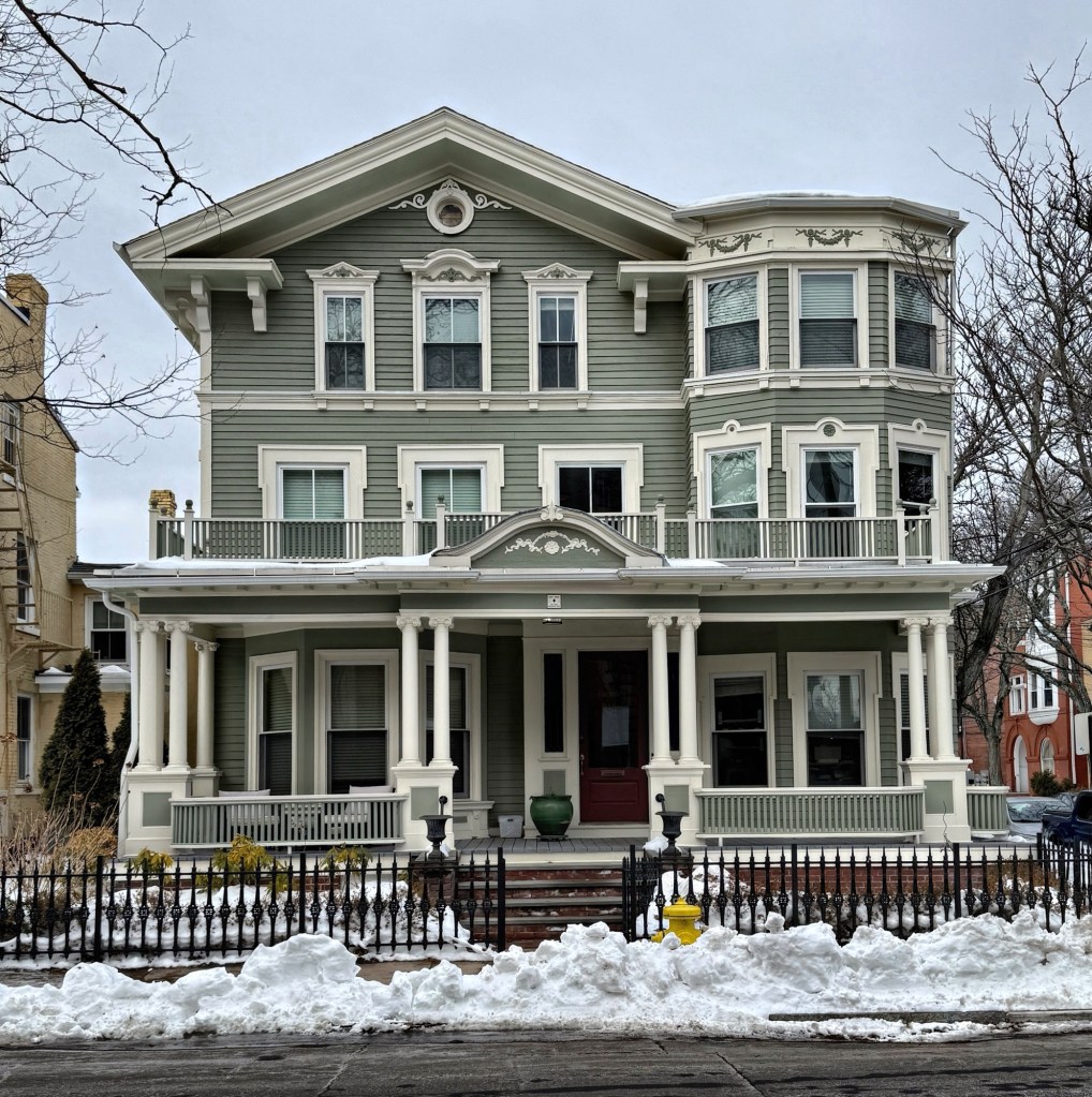 One of the eclectic mid-19th century residences in New Haven’s Wooster Square neighborhood is the Bromley House, an exuberant blending of architectural styles that have been lovingly preserved. The history is a little murky on this residence but from research, the home was built around 1850 and was possibly a two-story flat-roofed Italianate style design with three-bay facade and off-center entrance. The home was acquired by Joseph Bromley, who appears to have added a third-story with gable roof. After the Civil War, the property was purchased by Lyman Erving Bradley, a veteran of the war who was employed as a police officer and later as private security for an area factory. It appears that Mr. Bradley, before his death in 1901, had the property expanded with a whimsical front porch, three-story side addition, and applied ornament in the Queen Anne style. The home is today a three-unit condominium, similar to the three-deckers found in cities all over New England.