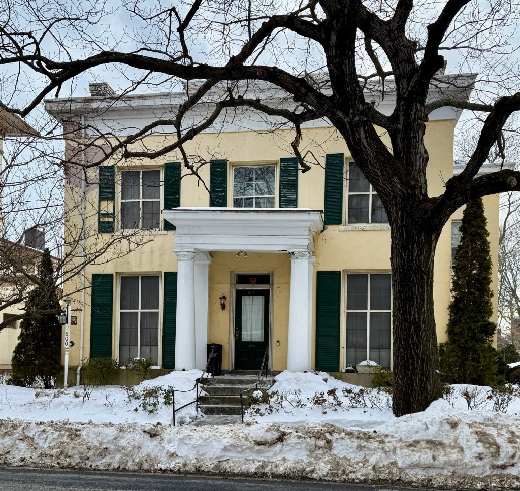The Soule-Parmelee House on Chapel Street in New Haven’s Wooster Square neighborhood is an excellent example of a mid-19th century Greek Revival style residence though with some deferred maintenance. The stately home was built in 1844 for Henchman Sylvester Soule (1800-1860) a merchant and trader who also partook in the California Gold Rush. After Soule’s death, the stucco Greek Revival style house was purchased by Henry S. Parmelee a piano maker, founder of the New Haven Trolley line and inventor of the first practical automatic sprinkler system, which he is said to have had installed in both his factory and his home here. Today, the Soule-Parmelee House operates as a bed & breakfast as the New Haven Historic Mansion.