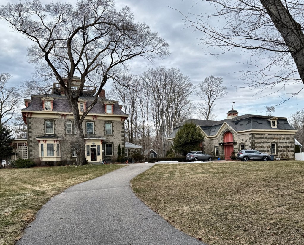 Stoneholm Manor is a historic estate tucked away in Sharon, Massachusetts, that remains one of the finest examples of a Second Empire style mansion and carriage house built of stone in New England. Stoneholm was built in 1865 for Horace Augustus Lothrop (1828-1898) within a year of his marriage to second wife, Sarah Gorham Swain. Horace A. Lothrop was a manufacturer and businessman with factories in Sharon and nearby towns and he invented innovative tools like hoes and wooden shanks for foot support in shoes and boots. He was also engaged in politics, serving in the state legislature and on the local school board. His country estate in Sharon is unique for its construction of locally quarried rock-face granite walls, fine mansard roof with cupola, and matching L-shaped carriage house, all in great condition. Stoneholm was listed on the National Register of Historic Places and remains a private residence.