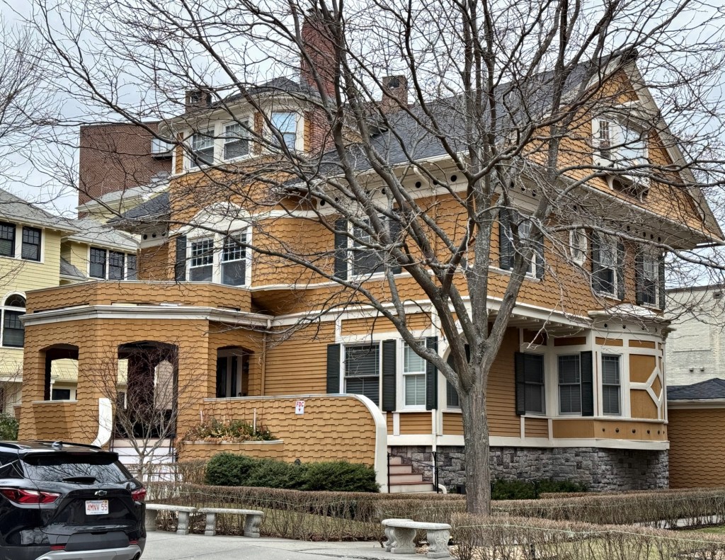 An expression of the Shingle style in all her beauty, the George B. Dexter House on Sewall Avenue in Brookline was built in 1885 both as a residence and a billboard advertising the owner’s business, really. The residence was built for George B. Dexter (1854-1935) a partner in the Dexter Brothers Company a paint and stain manufacturer that was a favorite of architects in the late 19th and early 20th centuries. For his Brookline residence, George Dexter hired architect S. Edwin Tobey to design this Shingled masterpiece with continuous shingle siding with rounded bays and a shingled piazza to showcase the stain products of his company. According to articles, Dexter also stained and painted the interior a variety of colors to showcase the wide range of options his company had. George Dexter would move to Pill Hill neighborhood in a new home just a decade after having this residence built, likely caused by the development of apartments and commercialization in the Coolidge Corner area by the turn of the century. The Dexter House was converted to a two-family in the 1920s and today has three condominium units, with owners clearly taking great pride in this significant residence.