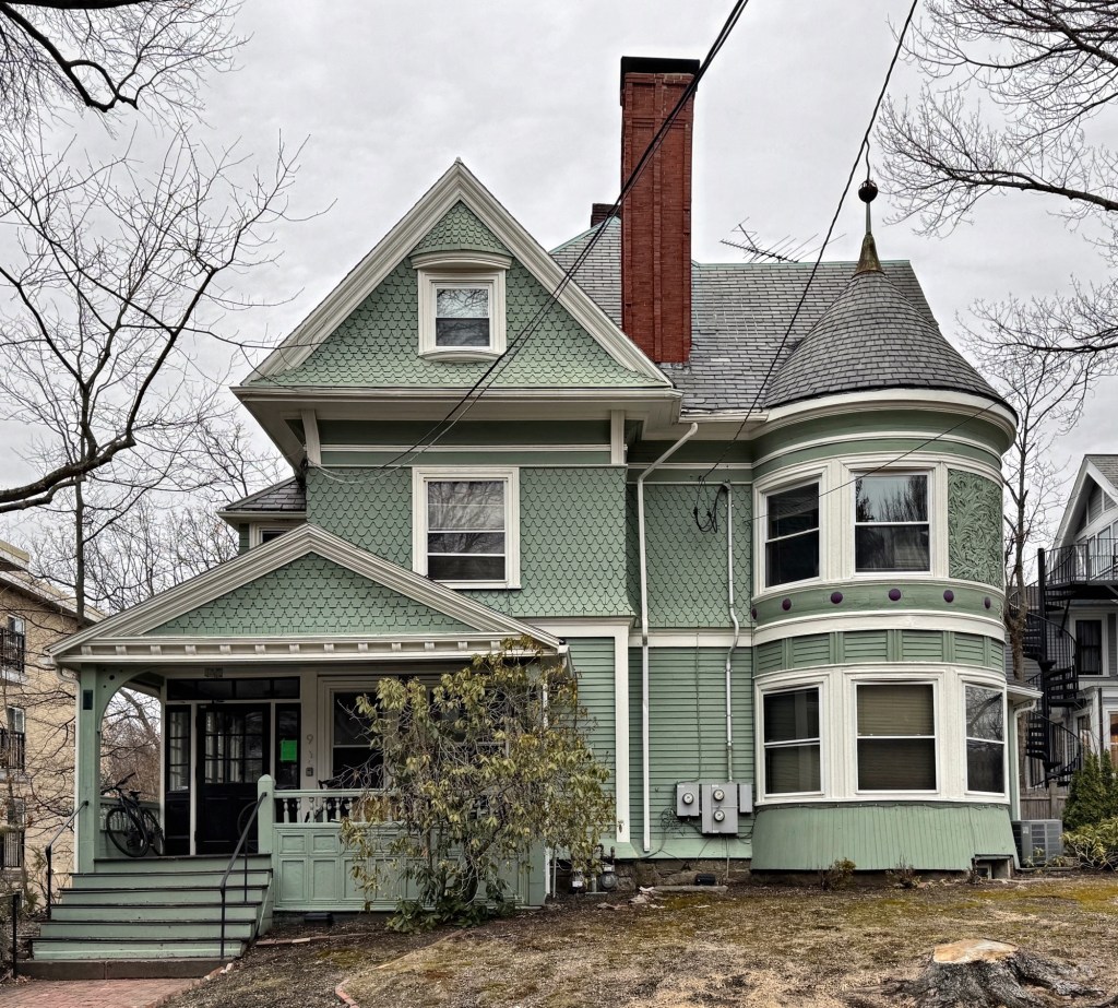 Built in 1883 for George Putnam May and his wife, Alice (Walworth) May, this Queen Anne style residence on Francis Street in Brookline, Massachusetts, contains all of the traits of the architectural style. George P. May was employed at the Walworth Manufacturing Company a plumbing pipes and equipment manufacturer founded by James J. Walworth, who was Alice May’s uncle. The property was subdivided on Alice’s fathers estate which fronts Kent Street nextdoor. I wonder if George wanted to live in the rear yard of his father-in-law! For their Brookline residence, the couple hired architect, S. Edwin Tobey, who paid great attention to detail. The May House features an asymmetrical plan, varied siding types, complex rooflines, and a corner tower with conical roof.