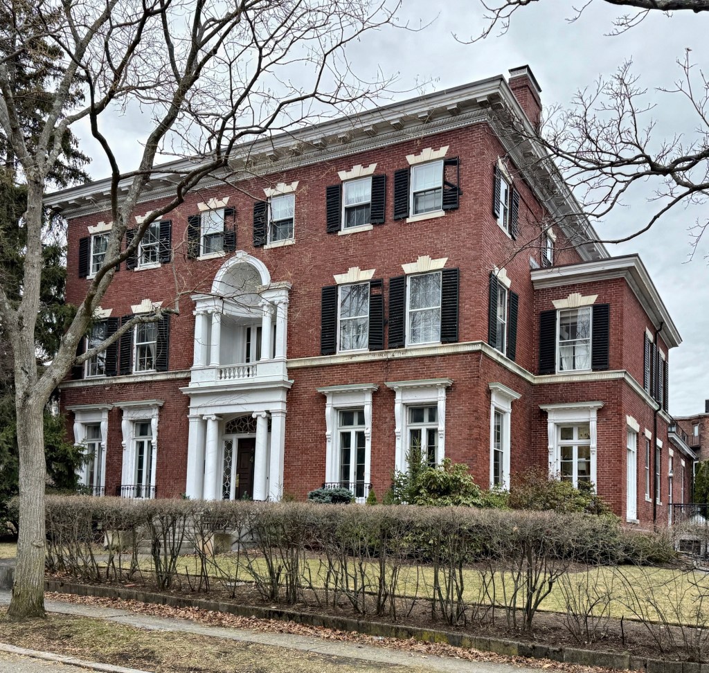 Among the area’s best examples of a high-style Colonial Revival residence of the early 20th century, the Eisemann Mansion on Monmouth Street in Brookline’s Longwood neighborhood stands out not only for its scale and massing, but unique architectural details. The dwelling was built in 1905 for Selly and Albert Eisemann, both German-born Jews who immigrated to the United States and originally lived in New Mexico before moving to Brookline in their retirement. Albert was a retired wool merchant, and clearly made a name for himself out west, hiring local architect, James Templeton Kelley, to furnish plans for his large mansion in Longwood. With a boxy form and five bay facade (with six smaller windows at the third floor), the center-hall mansion is notable for its elaborate first-floor windows with individual cornices, recessed entry set between Ionic columns, and recessed niche balcony over the entry as a unique interpretation of a Palladian motif.