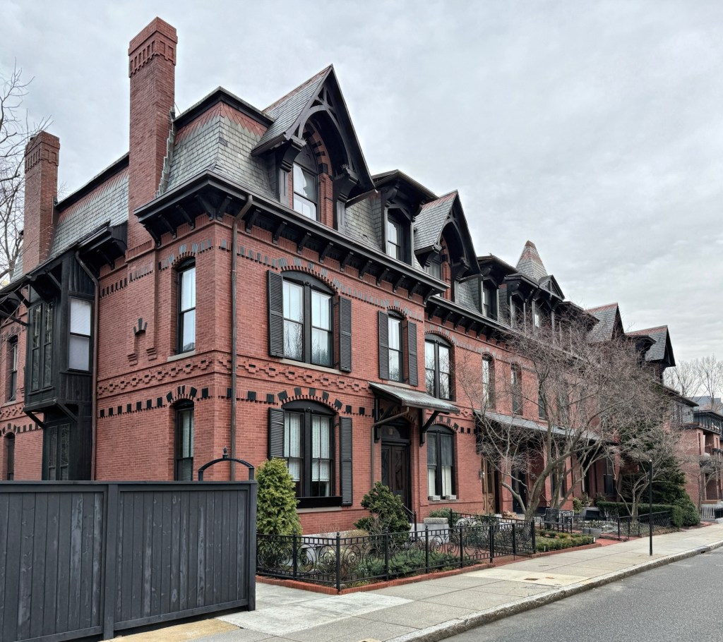 Amos A. Lawrence (1814-1886), a wealthy Boston merchant, owned land holdings in the present-day Longwood neighborhood of Brookline, just over the Muddy River from Boston, and developed the area into a wealthy and high-quality suburb. Lots were laid and Lawrence hired civil engineer, Ernest Bowditch, to plat for multiple sets of distinctive rowhouses surrounding a small green mall, which was later named Monmouth Court. Once the property was laid out, Amos Lawrence hired the Boston architects, J. Pickering Putnam and George T. Tilden, to design rowhouses for rental income. George Tilden was previously employed at the firm of Ware & Van Brunt, a firm that mastered and popularized the panel brick style in the Boston area in the 1870s and 1880s, and he clearly built upon this expertise for the rows for Amos Lawrence in Brookline. All four rows of houses are distinctive, yet compliment each other stylistically with projecting bays. intricate brickwork, complex rooflines with dormers, and applied ornament. This row at 10-18 Monmouth Court was from the designs of partner, J. Pickering Putnam and was highlighted in an architectural publication soon after completion. The row exhibits a slate mansard roof disrupted by dormers with trusses, lancet arch and trefoil motifs, polychromatic brick and pent roof entrances all stepping out to the private courtyard.