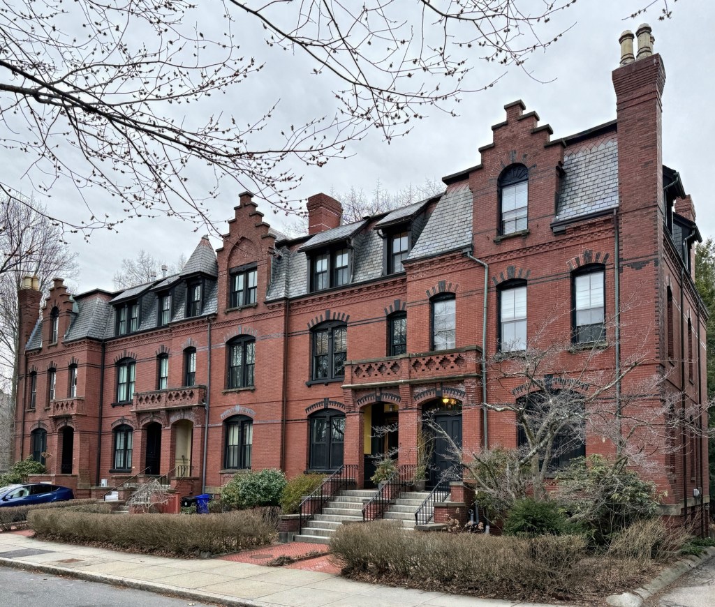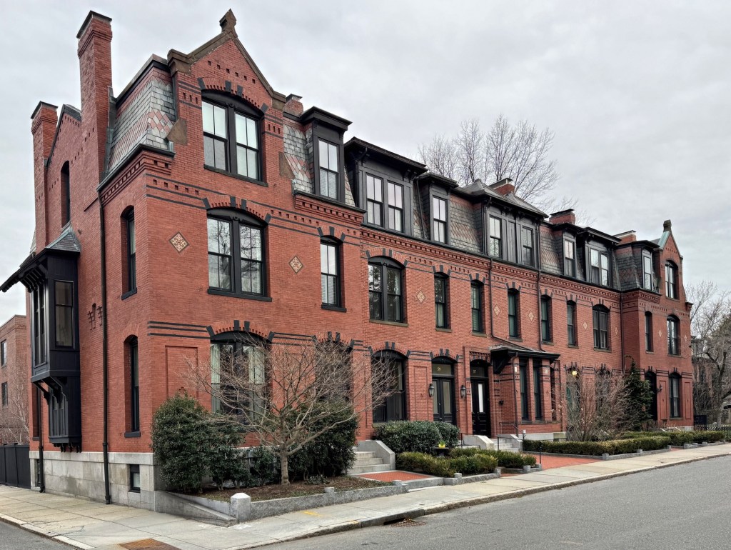 Amos A. Lawrence (1814-1886), a wealthy Boston merchant, owned land holdings in the present-day Longwood neighborhood of Brookline, just over the Muddy River from Boston, and developed the area into a wealthy and high-quality suburb. Lots were laid and Lawrence hired civil engineer, Ernest Bowditch, to plat for multiple sets of distinctive rowhouses surrounding a small green mall, which was later named Monmouth Court. Once the property was laid out, Amos Lawrence hired the Boston architects, J. Pickering Putnam and George T. Tilden, to design rowhouses for rental income. George Tilden was previously employed at the firm of Ware & Van Brunt, a firm that mastered and popularized the panel brick style in the Boston area in the 1870s and 1880s, and he clearly built upon this expertise for the rows for Amos Lawrence in Brookline. All four rows of houses are distinctive, yet compliment eachother stylistically with projecting bays. intricate brickwork, complex rooflines with dormers, and applied ornament. These two rows on the western side of Monmouth Court at 53-61 Monmouth Street and 19-27 Monmouth Court, were also likely the work of Putnam and Tilden, who practiced jointly for a couple years but published their work separately. Stylistically, the two Monmouth Street rows appear to be of the same architect, George Tilden with identical tilework and elements, and the two Monmouth Court rows as the work of Putnam with polychromatic segmental arches over the windows.