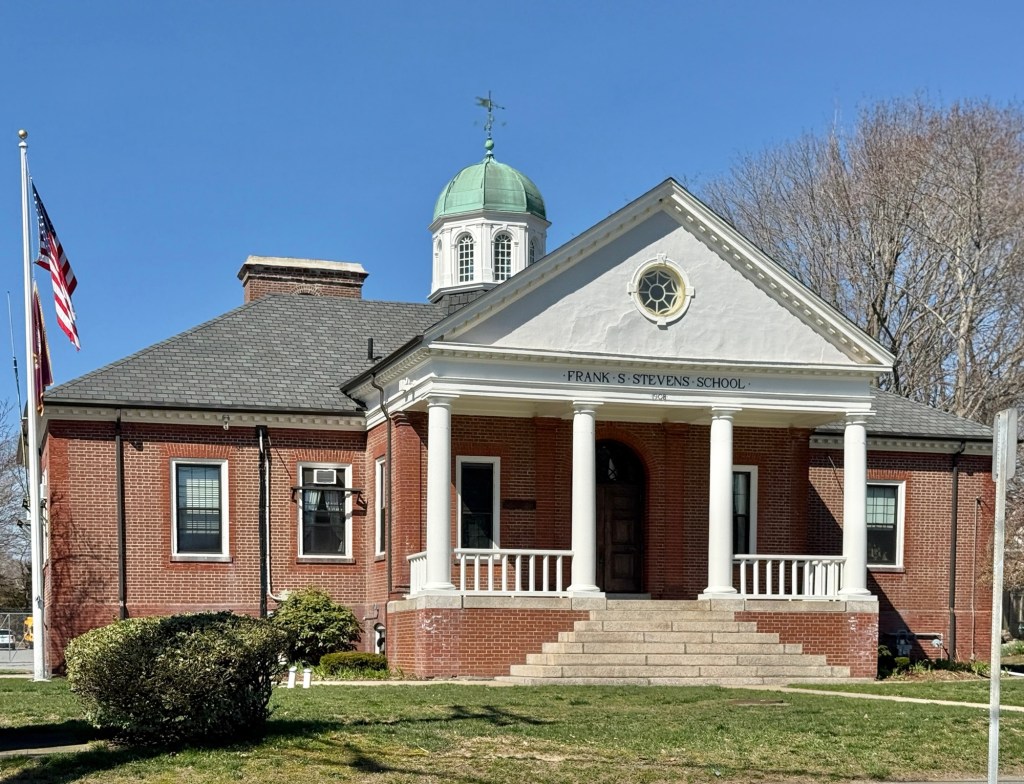 The Frank S. Stevens School in Swansea, Massachusetts, was one of a number of civic and institutional buildings donated to the small town by wealthy residents Frank and Elizabeth Stevens. Ten years after the death of her husband, Elizabeth Case Stevens retained her favorite architect, Henry Vaughan, to furnish plans for a new school building for the main village in her beloved town of Swansea, to be built in the memory of her late husband. Mr. Vaughan had already designed the town hall, library, and Episcopal church, and Mrs. Stevens thought it would be fitting for an architecturally appropriate public school to also be built in the quaint New England village. Neo-Classical in style, the one-story brick school building is distinguished for its full-height pedimented portico supported by classical Doric columns and a cupola atop the hipped roof. The school was eventually outgrown and is now the school administration building for the town’s three later public school buildings.