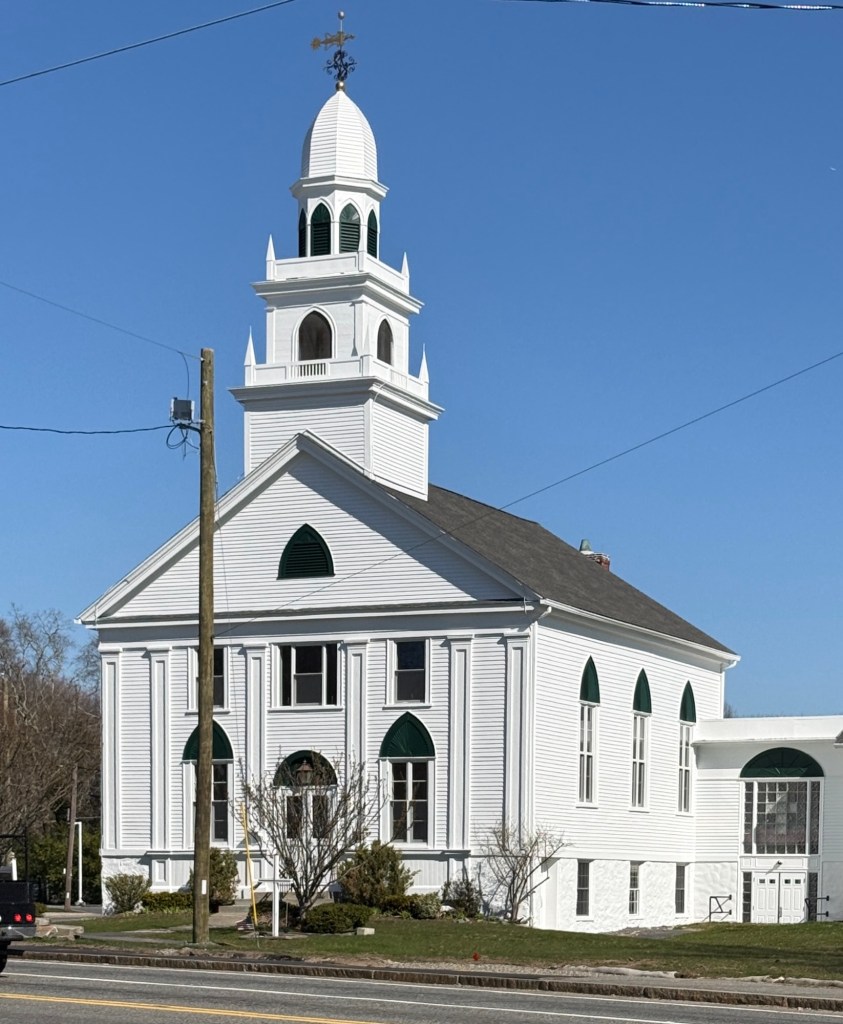 The United Church of Christ in Swansea, Massachusetts, was built in 1833 as the second building for the congregation which was originally organized in 1693. It is believed that this was the first church in New England to admit all Christians to membership regardless of their theological beliefs, as a United or Union church. The congregation’s first meetinghouse was built prior to 1719 and was replaced in 1833 when the current building was completed. The United Church of Christ in Swansea blends Greek and Gothic Revival styles with traditional wood-frame construction and gable roof with multi-stage steeple. The facade is adorned with pilasters and louvered lancet arches, showcasing the builder’s ability to pull from multiple architectural styles for the construction.