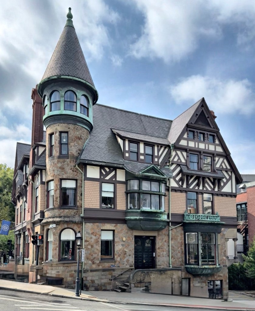 Perched on College Hill in Providence, Rhode Island, the Dr. George W. Carr Mansion at the corner of Benefit and Waterman streets, stands as one of the most attractive and interesting interpretations of the Queen Anne style in New England. The stately home was built in 1885 for George Wheaton Carr (1834-1907) a medical doctor who served as a surgeon during the Civil War and later as head surgeon for multiple Providence-area hospitals. For his Providence home, Dr. Carr hired architect, Edward I. Nickerson, to furnish plans, which resulted in this mansion with irregular plan, four-story corner corner capped with a conical roof, varied materials in stone, wood shingles, half-timbering, and copper bays. The Carr Mansion was purchased by the Rhode Island School of Design (RISD) in 1916, and has served a variety of roles for the school including as student housing and a cafe/lounge.