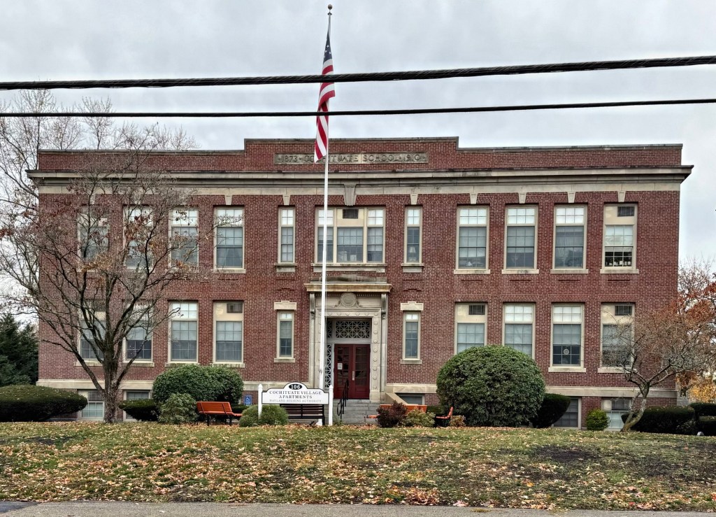 The Cochituate School in Wayland, MA, was built in 1910 to educate the Cochituate Village’s growing student population. The industrial village was dominated by shoe manufacturing with workers largely consisting of first- and second-generation European immigrants who moved to New England for work. Boston architect, Willard P. Adden, designed the school, which replaced an earlier schoolhouse on the site that was outgrown. The two-story, brick school was expanded following WWII, when a long rear ell with classrooms and a cafeteria was designed by Perry, Shaw & Hepburn. In the 1990s, the old Cochituate School was renovated and converted to senior housing administered by the Wayland Housing Authority.