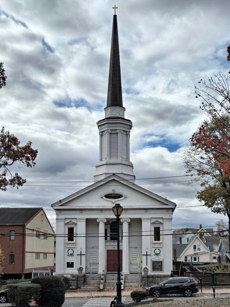 The Second Congregational Church of Derby was built in 1845 by members of the Birmingham Congregational Society, who grew tired of travelling across the river to the First Congregational Church in town. The present “downtown” of Derby was originally known as Birmingham and grew as the industrial center in the city, which historically was much larger than it is today. The Birmingham Congregation had this edifice constructed in the Greek Revival style, and it was added onto in 1859, 1889, and underwent alterations in 1915, when the facade was altered with Colonial Revival flourishes. The additions to the facade include the Palladian window, elliptical leaded window in the pediment, and panels with swags and wreaths. The top of the steeple was damaged by Hurricane Gloria in 1985 and removed, and was replicated in 2021.
