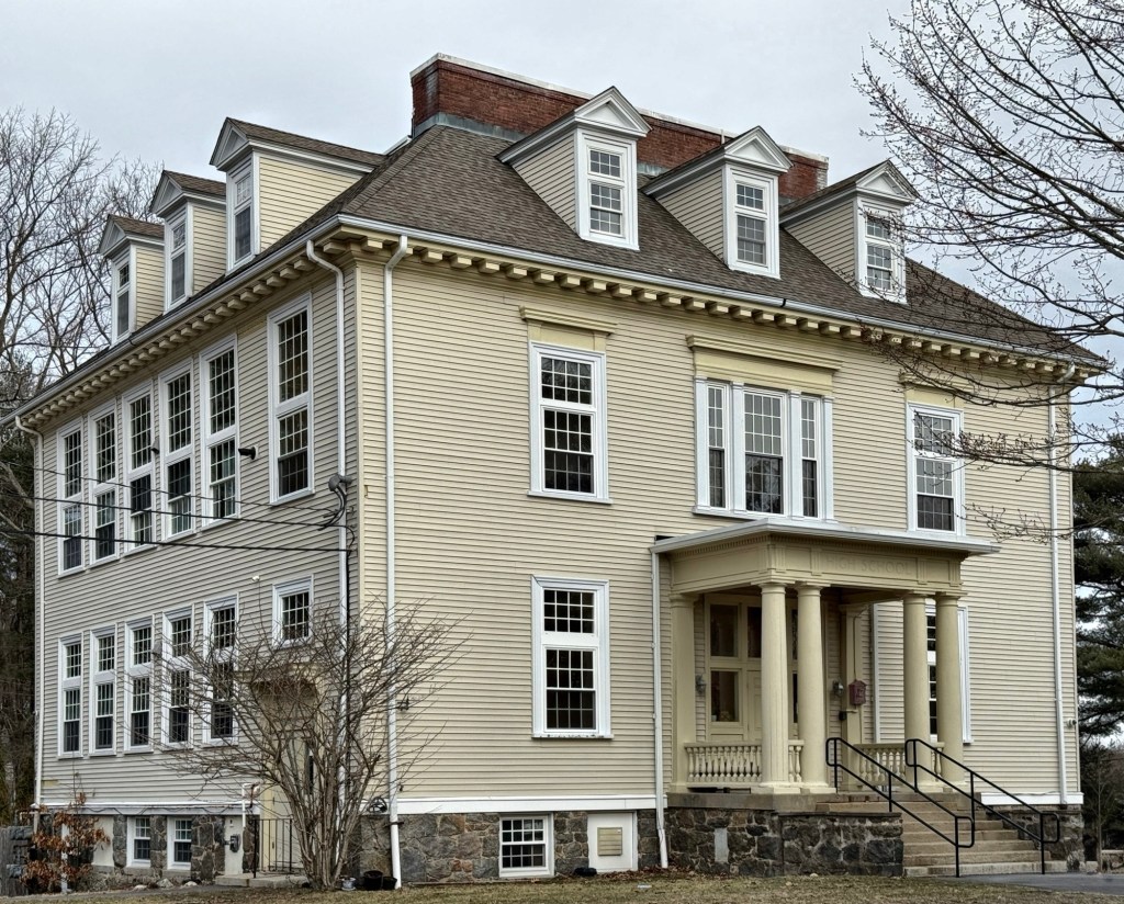 The former Pleasant Street High School in Sharon, Massachusetts, is an excellent example of early 20th century school architecture and adaptive reuse in a small Massachusetts town. The square, two-story, Colonial Revival style school building replaced an earlier school and was designed in 1910 by the firm of Adden & Parker. As with many communities, the school was outgrown and outdated after WWII and a new, consolidated high school was built in town. The former Pleasant Street school closed by 1981 and was subsequently converted to housing by the Sharon Housing Authority. The building is part of a local historic district, ensuring its preservation in perpetuity.