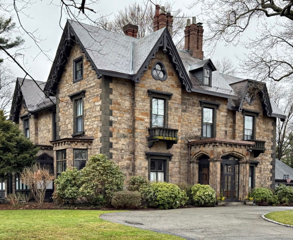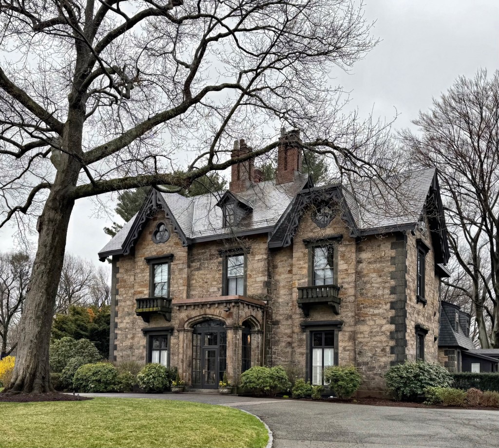 The Frederick Sears Cottage in the Cottage Farm neighborhood of Brookline, Massachusetts, is significant as one of the major surviving examples of Gothic Revival domestic architecture in the Boston area. In 1849, wealthy Bostonian, David Sears (1787-1871) laid out parks and squares in the Cottage Farm neighborhood, and built houses for himself and his children. His own house, erected in 1843, was the oldest, soon followed by houses for his four daughters, Ellen d’Hautville, Harriet Crowninshield, Anna Amory, Grace Rives, and son, Frederick. The Frederick Sears Cottage is the only surviving Sears residence in the Cottage Farm neighborhood. Frederick Sears‘ cottage was built in 1851, though he did not occupy the house long, as just three years after he and his wife married in 1852 to move into this home, Marian died. The house was inherited by Frederick Sears Jr. , and was acquired by Boston University in 1960, who began to expand into this neighborhood. They maintain the significant property very well. The Sears Cottage is an excellent example of the Gothic Revival style in stone with scalloped vergeboards, quatrefoil motifs, corner quoins, and projecting entry. The house is constructed of Roxbury Puddingstone and is said to have been designed by George Minot Dexter.