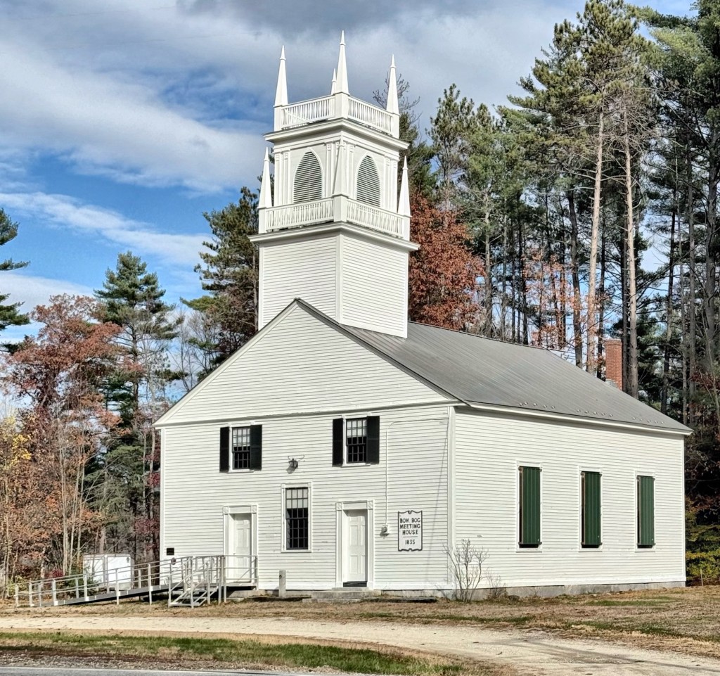 The Bow Bog Meetinghouse in Bow, New Hampshire, was built in 1835 for the First Methodist Episcopal Church and Society in town. Designed in the Greek and Gothic revival styles, the traditional form and paired entries with two stage belfry is adorned by finials and pilasters, showcasing an elegant blending of these two styles. built by George Washington Wheeler for the First Methodist Episcopal Church and Society of Bow in 1835. Mary Baker Eddy, founder of the Christian Science Church, mentioned Reverend Orlando Hinds as a contributor to her early religious teachings. She maintained close ties with this Church, donating funds for the bell in 1903. The Church provided religious instruction and social activities for 116 years and in 1951, the Church was closed and the Bow Bog Meeting House Society acquired the building. In 1970, they restored it to nearly its original condition, and it was acquired by the town in 1985.