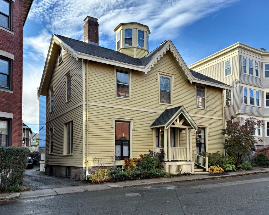 The Lindens neighborhood, located just east of the civic and commercial core of Brookline Village, was long an apple and cherry orchard known as Holden Farm. Beginning in 1843, the area became the earliest planned development in the town and was laid out as a “garden suburb” for those wishing to escape the growing congestion of Boston. As originally conceived in 1843, it reflected the latest ideals of planned residential development for a semi-rural setting on land owned by Thomas Aspinwall Davis. The streets, parks, and house lots here were laid out by civil engineer, Alexander Wadsworth, who two years earlier, laid out plans for Mount Auburn Cemetery in Cambridge, the first “Rural Cemetery” in America. Early homes were built on speculation by John F. Edwards, an architect-builder, for Davis, who was strict about high-quality designs in the Greek and Gothic revival styles in his newly laid out neighborhood. This stately house was built as Thomas Aspinwall Davis’ own residence in the Gothic Revival style. The house originally had a Gothic style full-length porch, but when the house was relocated in 1903 to the present site, to make room for new houses as the neighborhood grew denser. During the move, the porch was removed, but the Davis House still maintains the belvedere at the roof, historic window trim, and decorative bargeboards at the eaves.