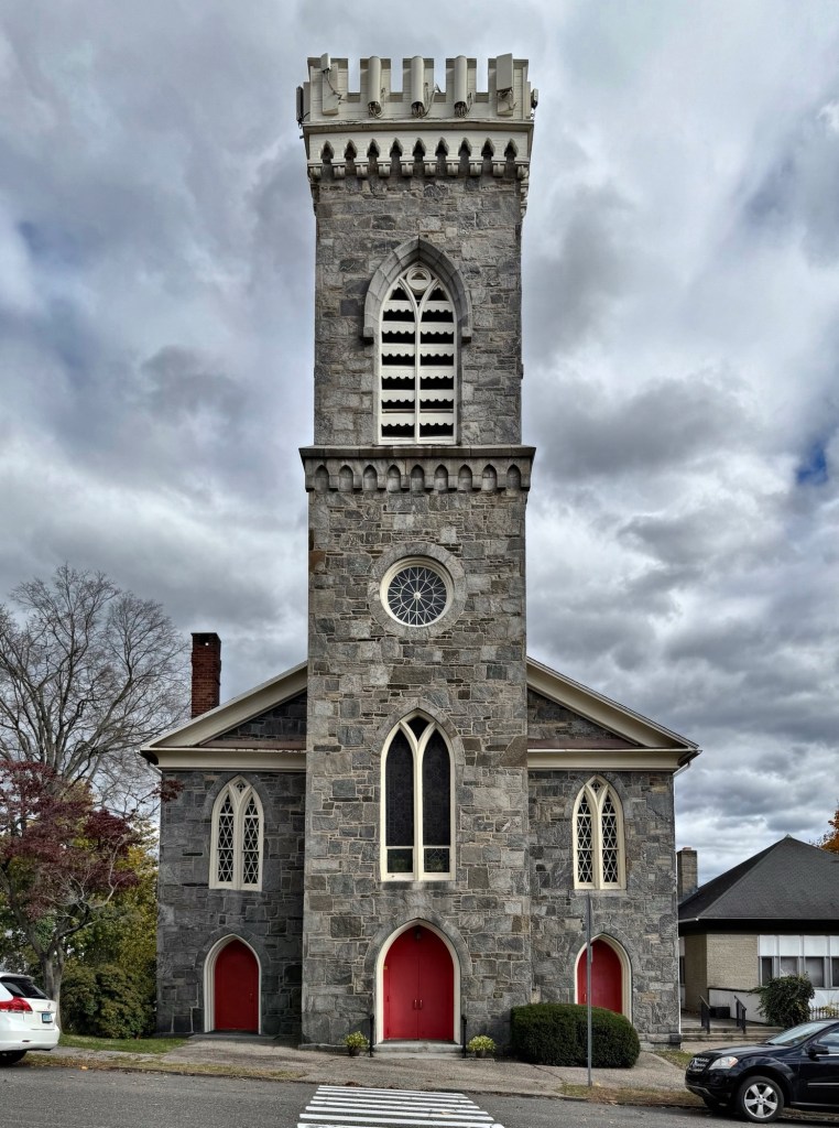 The Gothic Revival style Immanuel St. James Episcopal Church of Derby is a landmark example of the style in this part of Connecticut and serves as the eastern anchor to the Birmingham Green in town. The church dates to 1843 and was built by The stone church was was built by stonemason, Harvey Johnson and Nelson Hinman, a carpenter. The land for the church was donated by Sheldon Smith and Anson G. Phelps, wealthy industrialists in town. The building originally had a wooden steeple, which was replaced by the present stone belfry in 1853. The church merged with another area congregation, which together, have preserved this significant structure, though the communications antennae on the battlements on the belfry is unfortunate.
