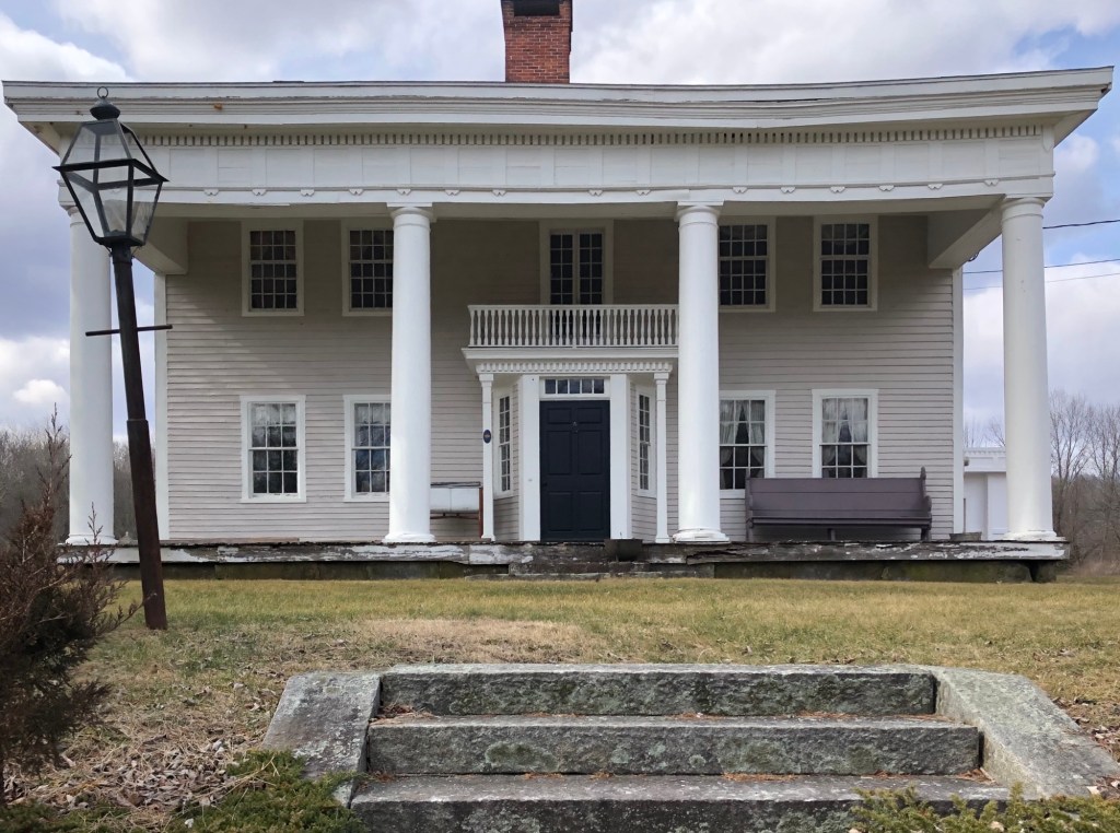 Renovated in the early 20th century from a Federal style farmhouse, “The Pillars” in Canterbury, Connecticut, is an extravagant example of a Colonial Revival style residence in this quiet part of the state. The Pillars was the creation of Frank Edwin Miller (1856-1947) and his wife, Hattie Jenks Miller. The Miller’s retired here in 1913 after Hattie inherited the family homestead, which dated to the late 18th century, and they had the home renovated, adding the massive two-story columned porch and projecting entry. The house is a visual representation of the difference between Colonial and Colonial Revival styles as this home, the latter example, is a free interpretation of its prototype with exaggerated architectural details in a scale not seen centuries earlier.